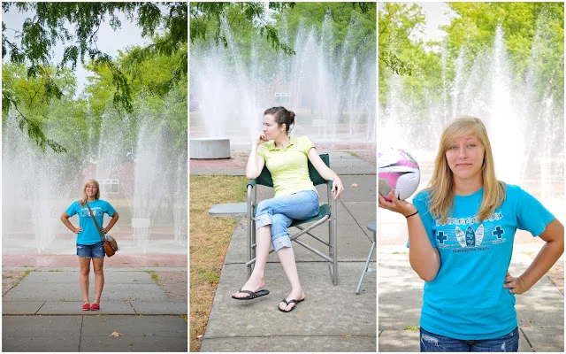 And the Pink Shirt Brigade went back to work! Because our original location (against the brick wall) was now in direct light, we went for a more “exotic” look with the park’s fountain and found the spot under the shade of some trees.