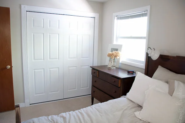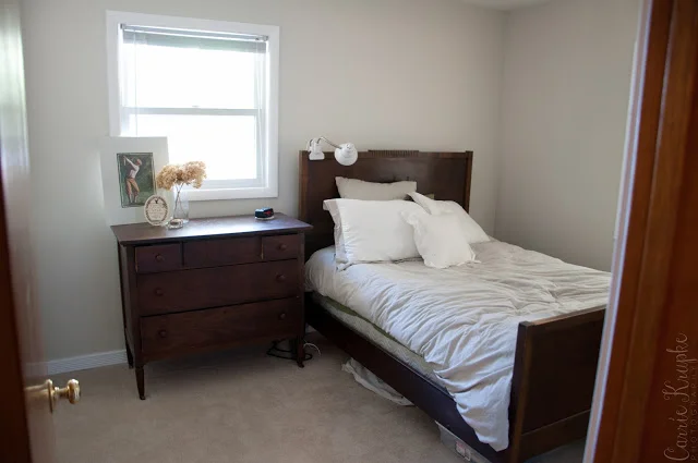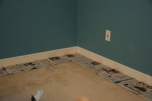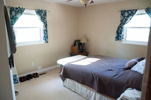 Gerard put newspaper underneath the trim while painting to protect the carpet in both rooms. When it came to painting the walls it wasn’t as easy as picking white. We thought we had the right color for the guest room and it turned out darker than anticipated, so we headed back and tried a second time. The master was right on the first try, thankfully! Guest room is a linen color and the master is a soothing beige. Because we worked to match the wall with a fabric sample from each room, they were custom made and I can’t tell you a specific name of either color. Sorry!