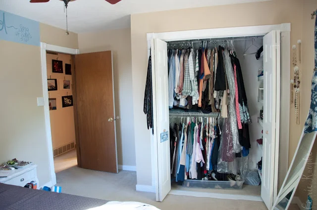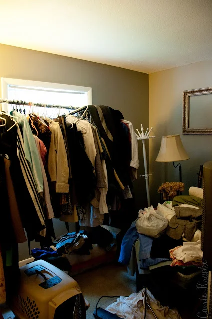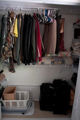 The guest room closet houses all of our winter bedding (left shelving), luggage, suits and costumes. See all the extra plastic containers on the bottom? We were able to sort through the clothes that were in there and find better places for them, whether it was Goodwill or our closet. I feel lighter already!