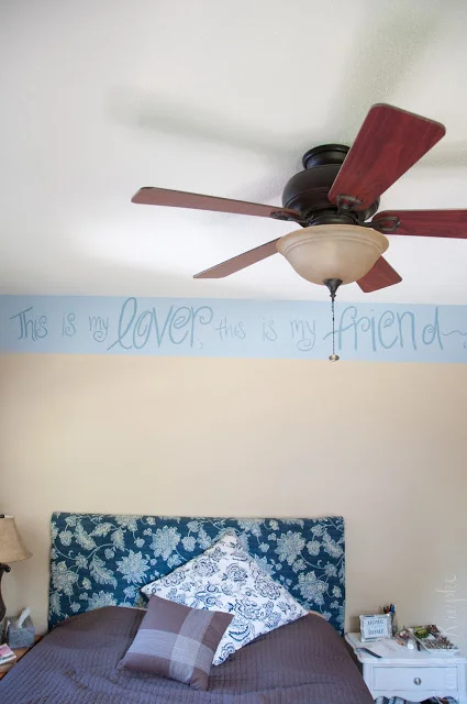 We wanted to keep the verse on the wall as a throwback to our original paint job but needed a frame to…well….frame it. So we’ll be painting some decorative trim in whatever spare time we can find and nail-gunning it to the wall. 🙂 We’ve had wedding photos above our bed the past 4 years but after Gerard’s hard work painting, we’re thinking really hard before we put any additional nails into the wall. We’ll get there eventually!
