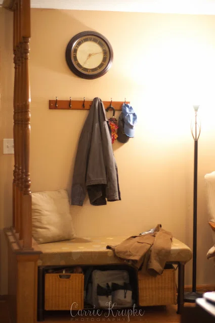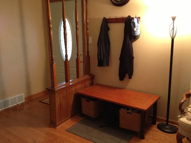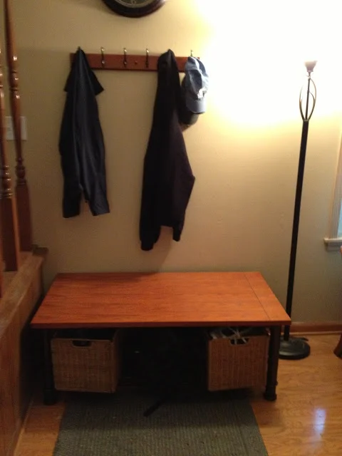 Oftentimes I’m so excited to get a project started that I just whip out the iPhone to get the “Before” shots and “in the middle of” shots. Our most recent improvement to our entryway made it a bit cushy. We had originally found this coffeetable at a garage sale with two side tables for $80 total and have used them all over the house as we’ve seen fit. Right now, one side table is in our guest room, the other is a side table in our living room. Now, the longest of the tables is serving as a pseudo-mudroom area to sit on while you put shoes on or off.