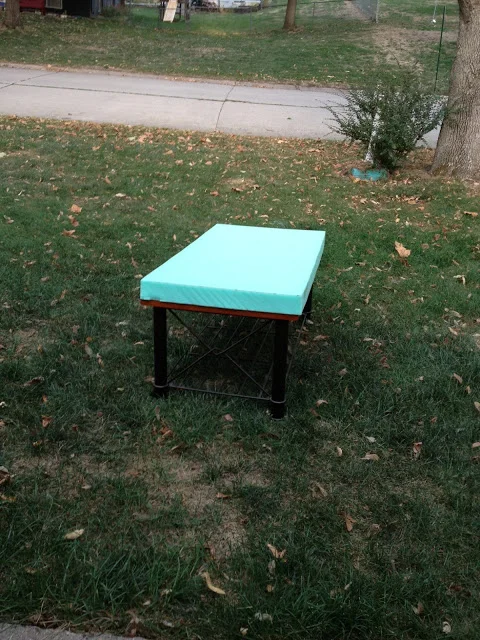 After a trip to JoAnn’s, picking out the fabric and a piece of foam to fit the top of the table, I was ready to get going.