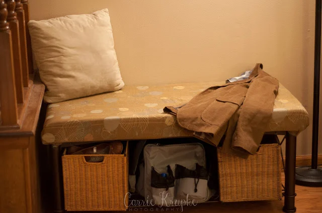 The baskets underneath hold my shoes (left side) and Gerard’s (right side). Center is Gerard’s ultimate frisbee athletic bag. I love the storage! 🙂 The pillow was an extra from our couch a mere 10 feet away.