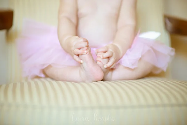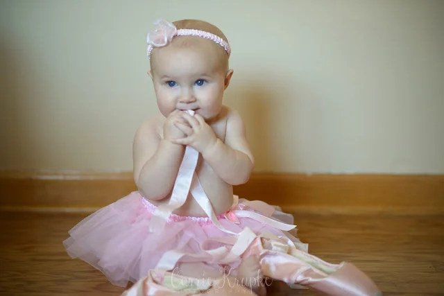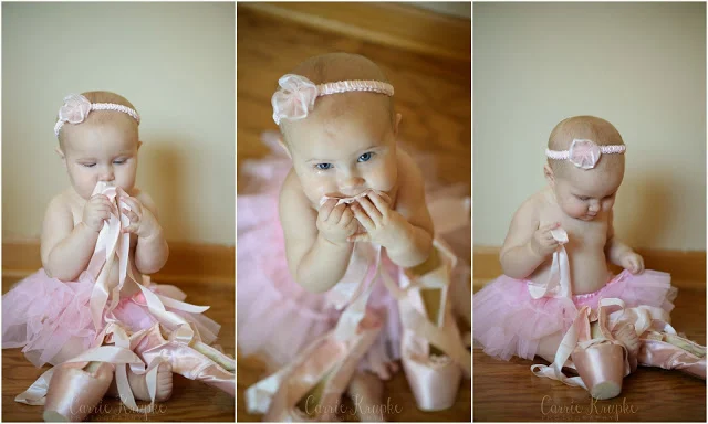 Lastly, Jessalyn brought her ballet slippers that made their first appearance with Kayla’s newborn photos. Now, instead of propping them next to her as a size comparison, they can get gnawed on a little too! 🙂