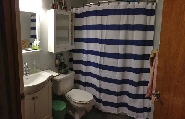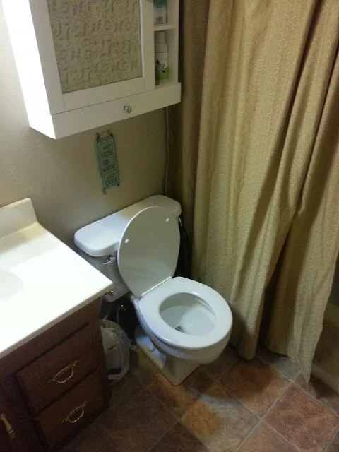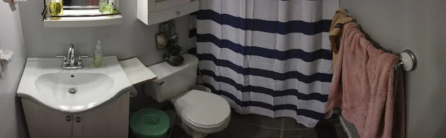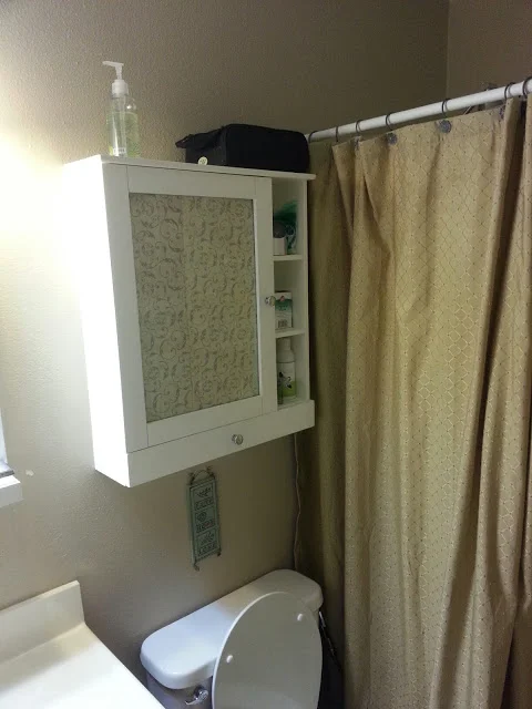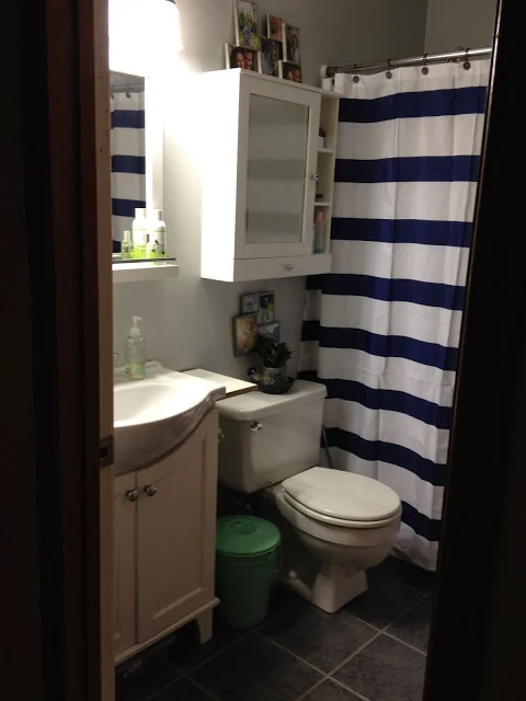, we got things back to their places-same toilet installed, new vanity arrived and Ben helped us hook it up on a Sunday afternoon. The painting had been done a while back and Gerard re-attached the medicine cabinet, mirror and shower curtain. I purchased a new curtain from Target to go with the wall and tile color and put some photo frames up. I also found some scrapbook paper in my stash to put in the medicine cabinet mirror that matched the paint. Our new vanity had a smaller foot print so we had finally had a space for Laidy’s cloth diaper pail. You’ll see in the image below the light green pail and right above it, there’s a shelf Gerard added to the vanity for more countertop space that’s perfect to hold his crew kit.