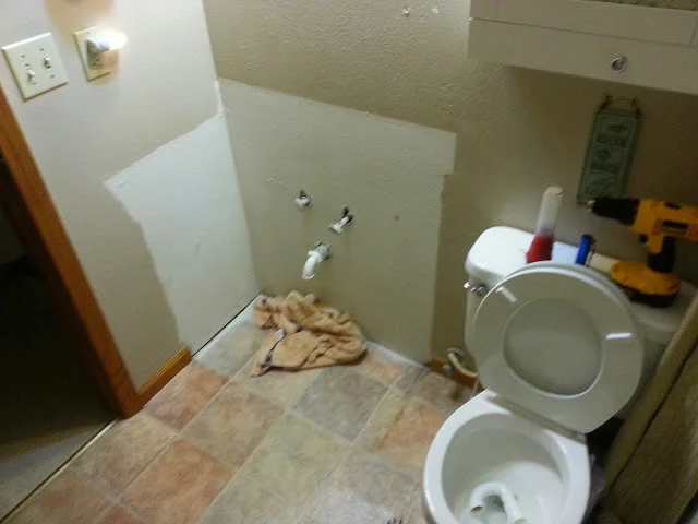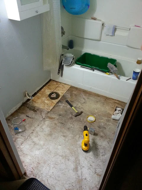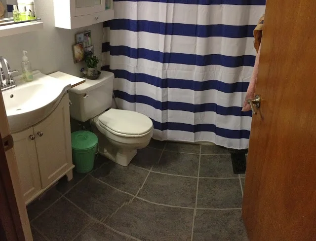 I claim that musicians have impeccable timing and this project was spot on. One random free evening, we saw an ad on TV for a special at Menard’s and we pounced: we came home with tile, paint to match, and a bathroom vanity on special order. Several weeks later, we found ourselves in the middle of a free weekend and Gerard pulled out the old vanity and the toilet, ripped out the vinyl flooring and trim, and took the medicine cabinet and mirror off the wall to prep for painting.