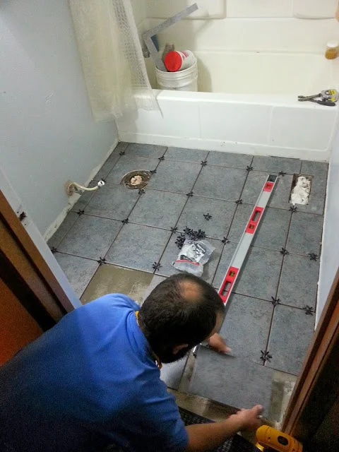 Ben got the tile done in an afternoon and honestly, the rest of the details are hazy because two days later, Gerard & I were struck by the stomach bug Laidy had. So, we had a working shower upstairs and a working toilet/sink downstairs. Impeccable timing.