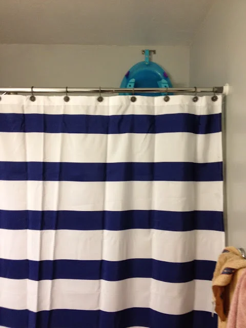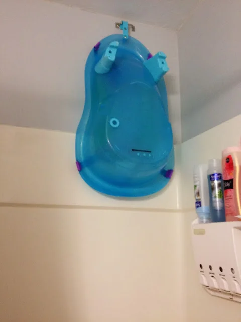 As arduous as the rest of the bathroom work was, this might be my favorite feature: Laidy’s new tub location! Before, we’d hang it on the shower curtain rod, or our towel rod, hanging on a small rod in our shower, or it’d just be on the floor taking up precious square footage. No matter where it was, it was always in our way. We had the idea to hang it in the tub, but high and out of our way so that we wouldn’t be infringed upon while we were showering. It now hides up in the corner and I can easily lift it down, or put it back up one-handed, with Laidy on my other hip. Gerard found the tool to do the deed: a cabinet door handle for less than $2!