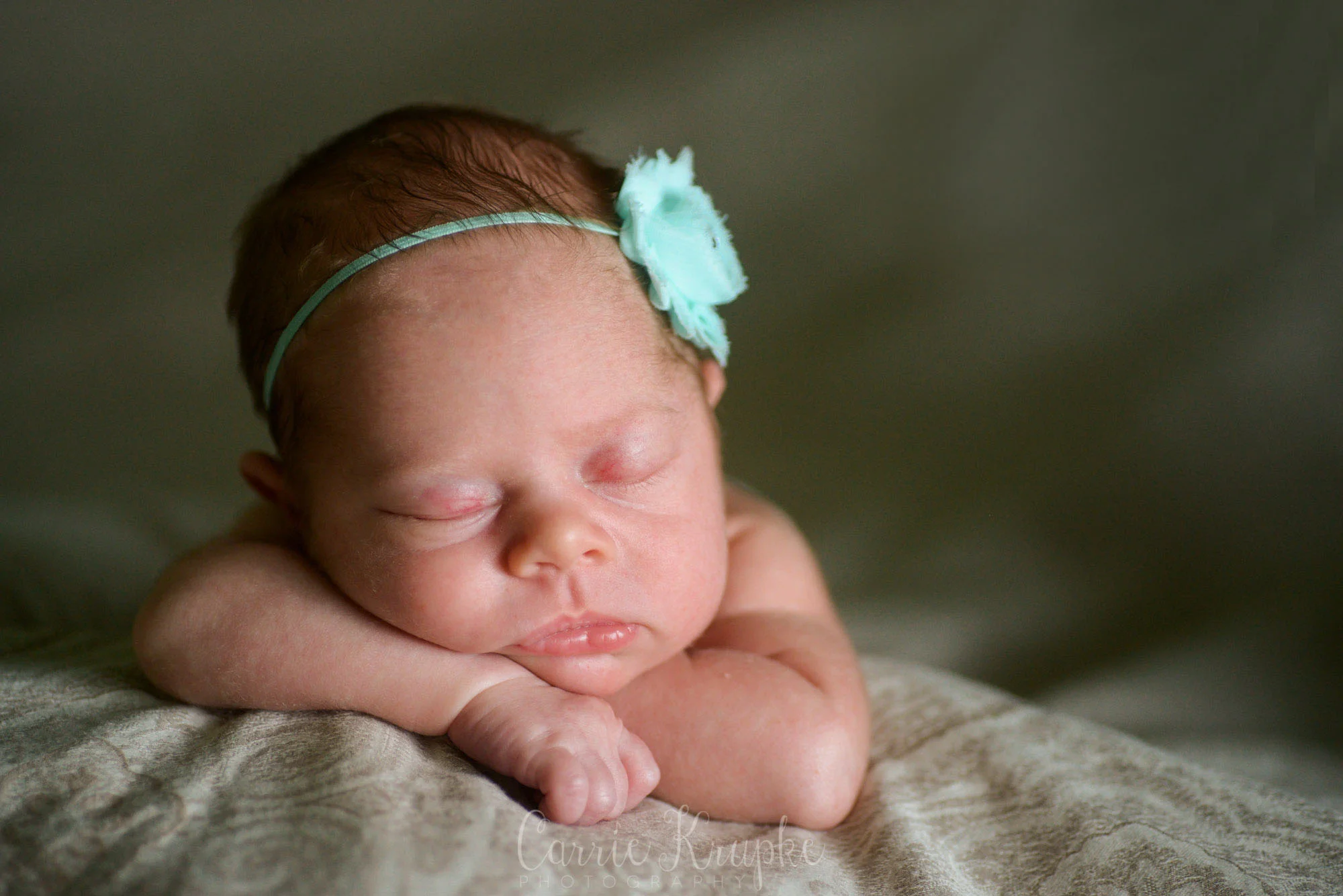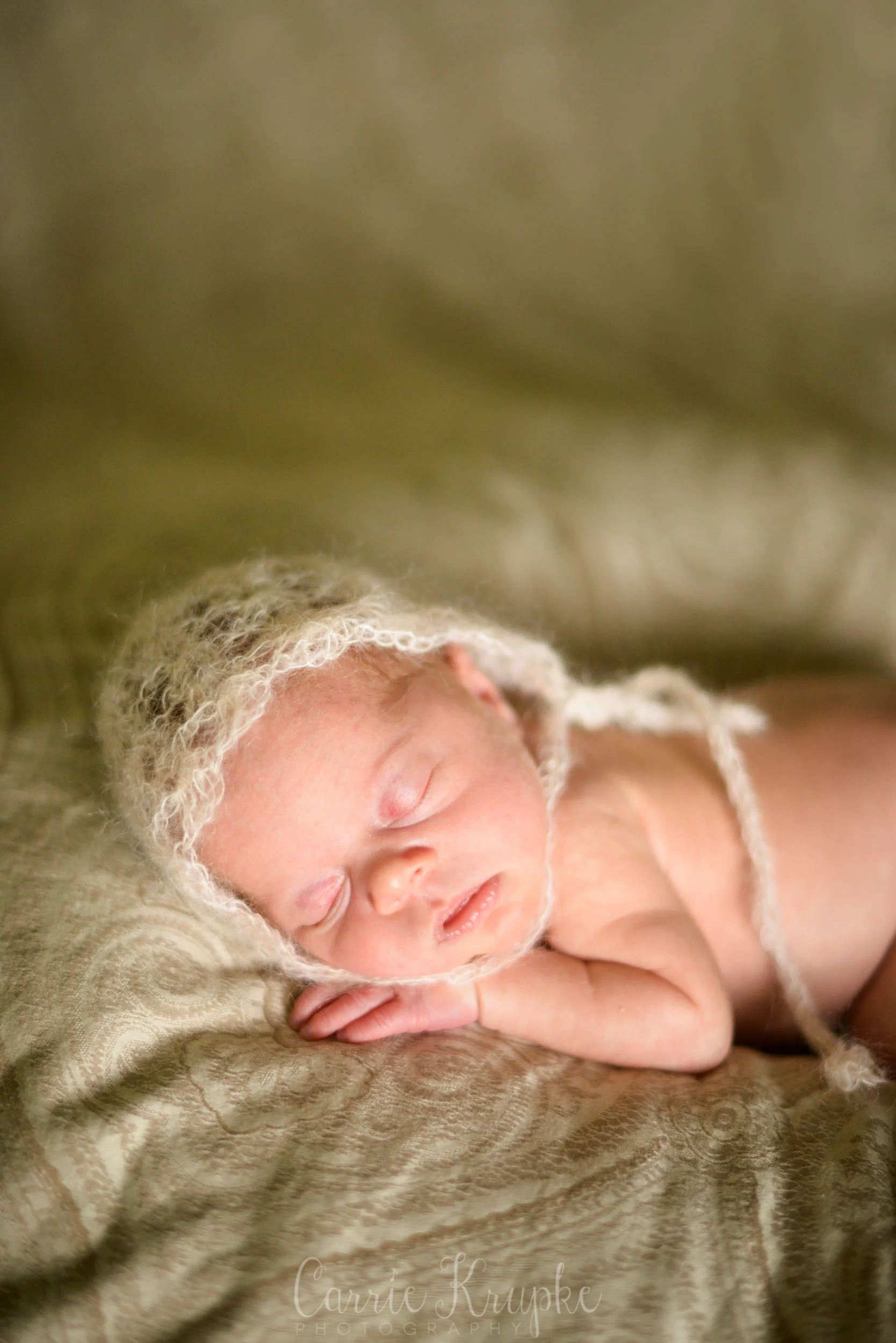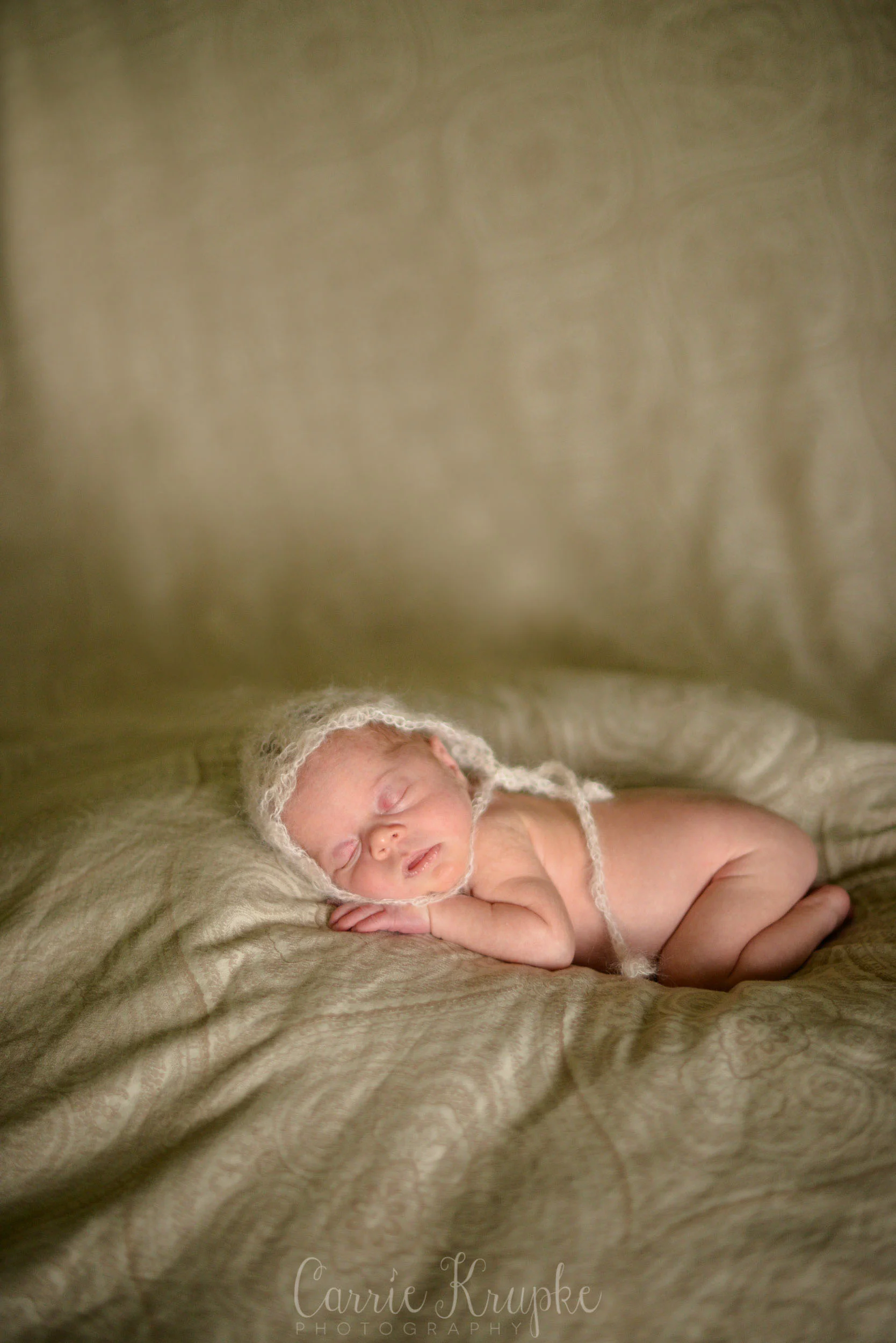 Ava has tipped the scales at over 5lbs now and it was really fun to see her wrinkles and hear her mama say she was getting “chunky”!! Even at 4 weeks of age, because of her size and premie status, after a good meal of mama’s best, she was happy as a clam and we were able to change up a bunch of her headpieces for fun. I have to put in a plug for my source of some of these headpieces, specifically the one directly below. Tasha of k1sew2 created several hats, beanies and fun things for babies to wear during their newborn session. If you’re searching for anything adorable for the baby in your life of any size, give her a holler!