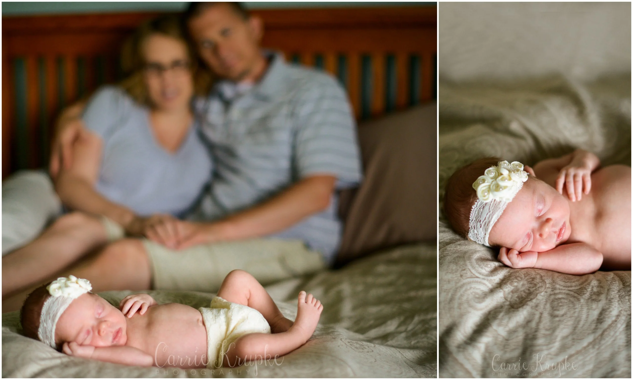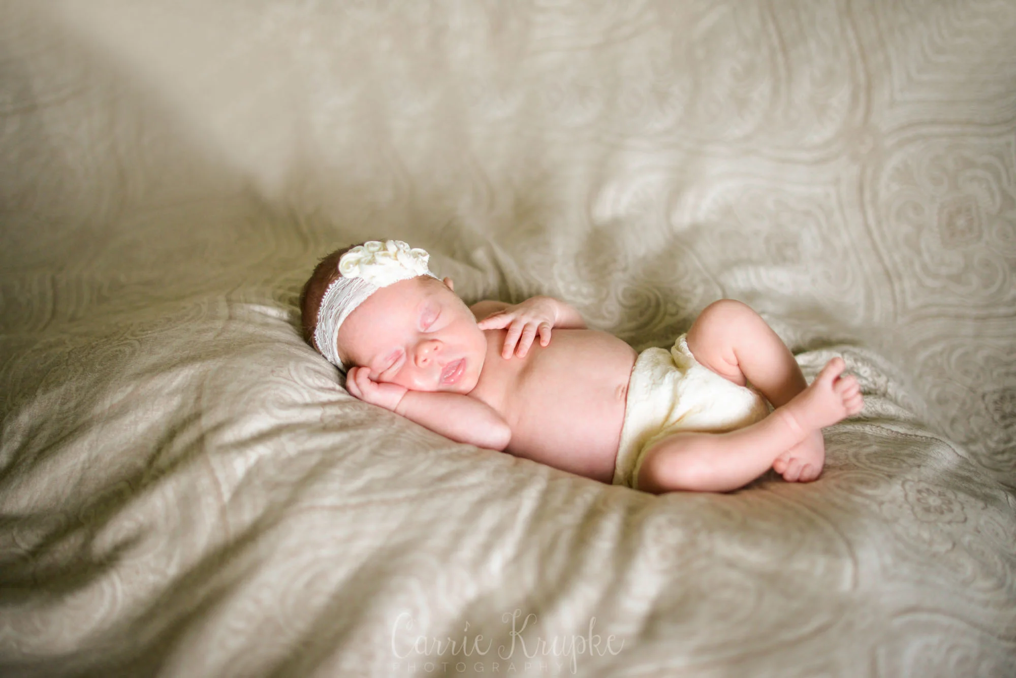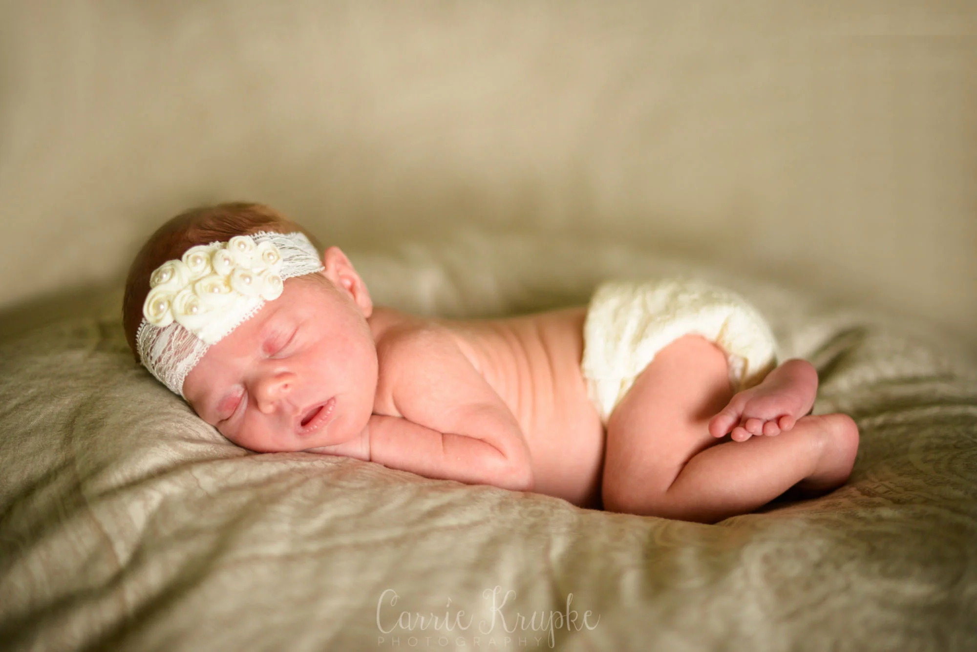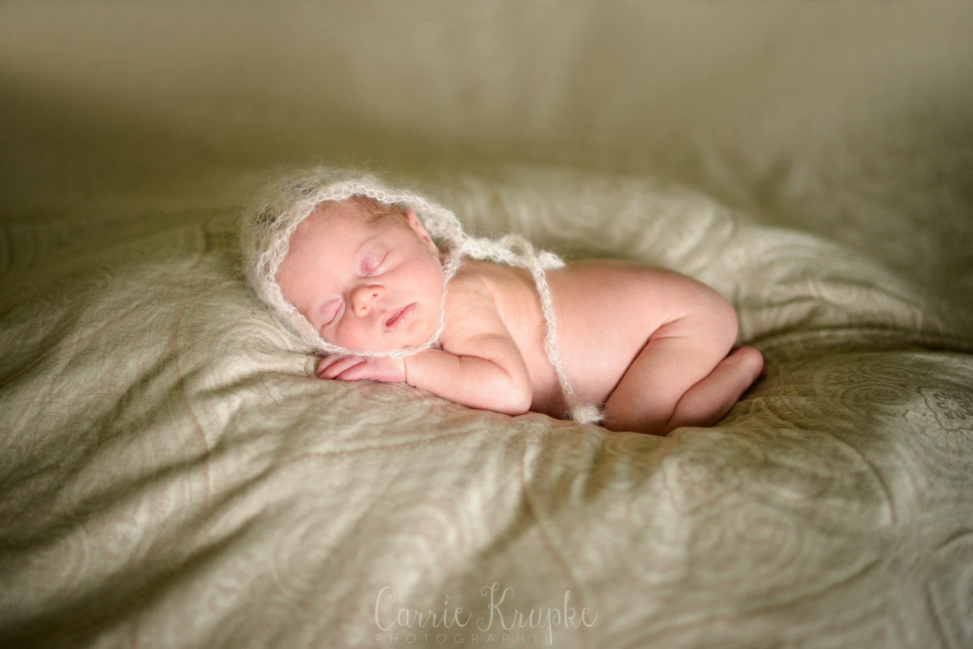 Ava has tipped the scales at over 5lbs now and it was really fun to see her wrinkles and hear her mama say she was getting “chunky”!! Even at 4 weeks of age, because of her size and premie status, after a good meal of mama’s best, she was happy as a clam and we were able to change up a bunch of her headpieces for fun. I have to put in a plug for my source of some of these headpieces, specifically the one directly below. Tasha of k1sew2 created several hats, beanies and fun things for babies to wear during their newborn session. If you’re searching for anything adorable for the baby in your life of any size, give her a holler!