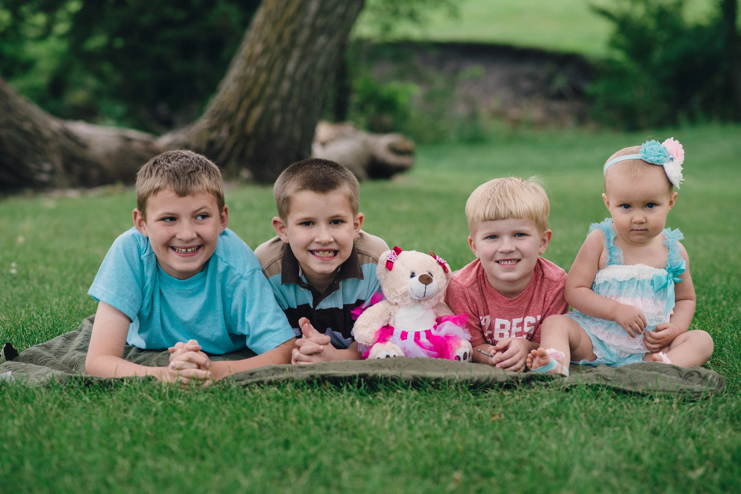 I mention five children, though four are technically in the photo below. Jessalyn and Mark lost a child, a girl, and the teddy bear was a gift–weighing the same as their daughter did when she passed away. So, when we get a shot of all the siblings together, I knew immediately to include the bear, though I’m unsure if I placed her in the right spot chronologically…The boys didn’t seem to mind!