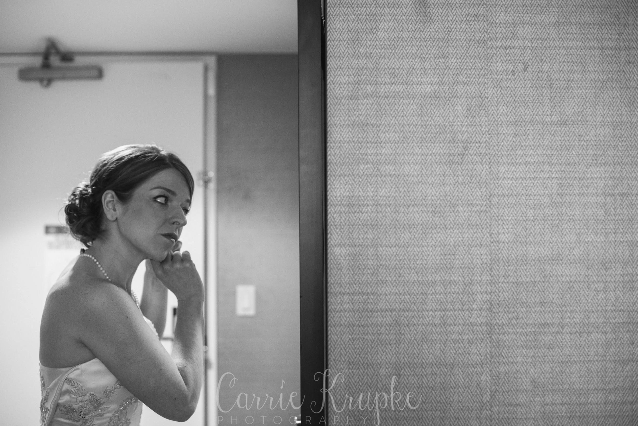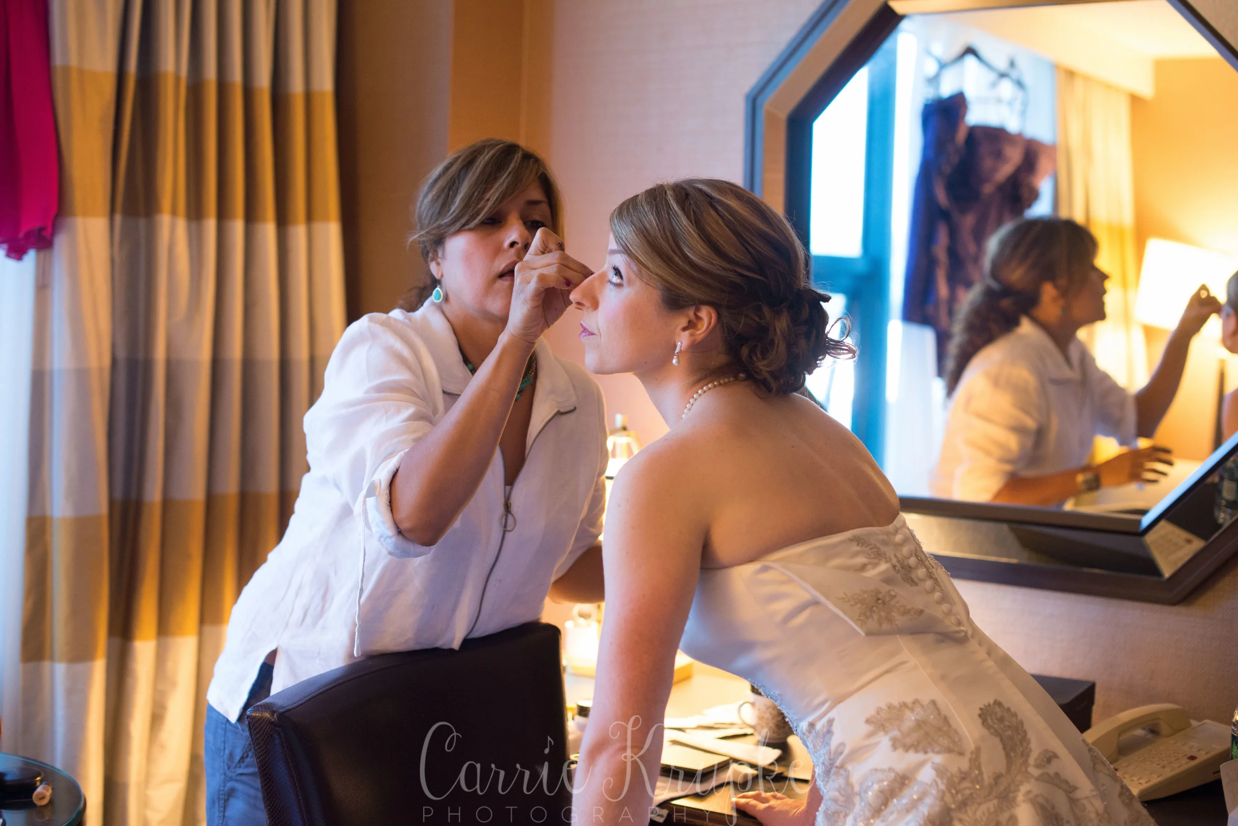 The day started at the hotel where Hillary was readying among a flurry of her bridesmaids’ activity. Hillary was quite content to be pampered in a comfy chair with her signature bag of Nestle chocolate chips. She would only give up that bag for a higher cause: putting on the dress that made her cry when she first put it on: