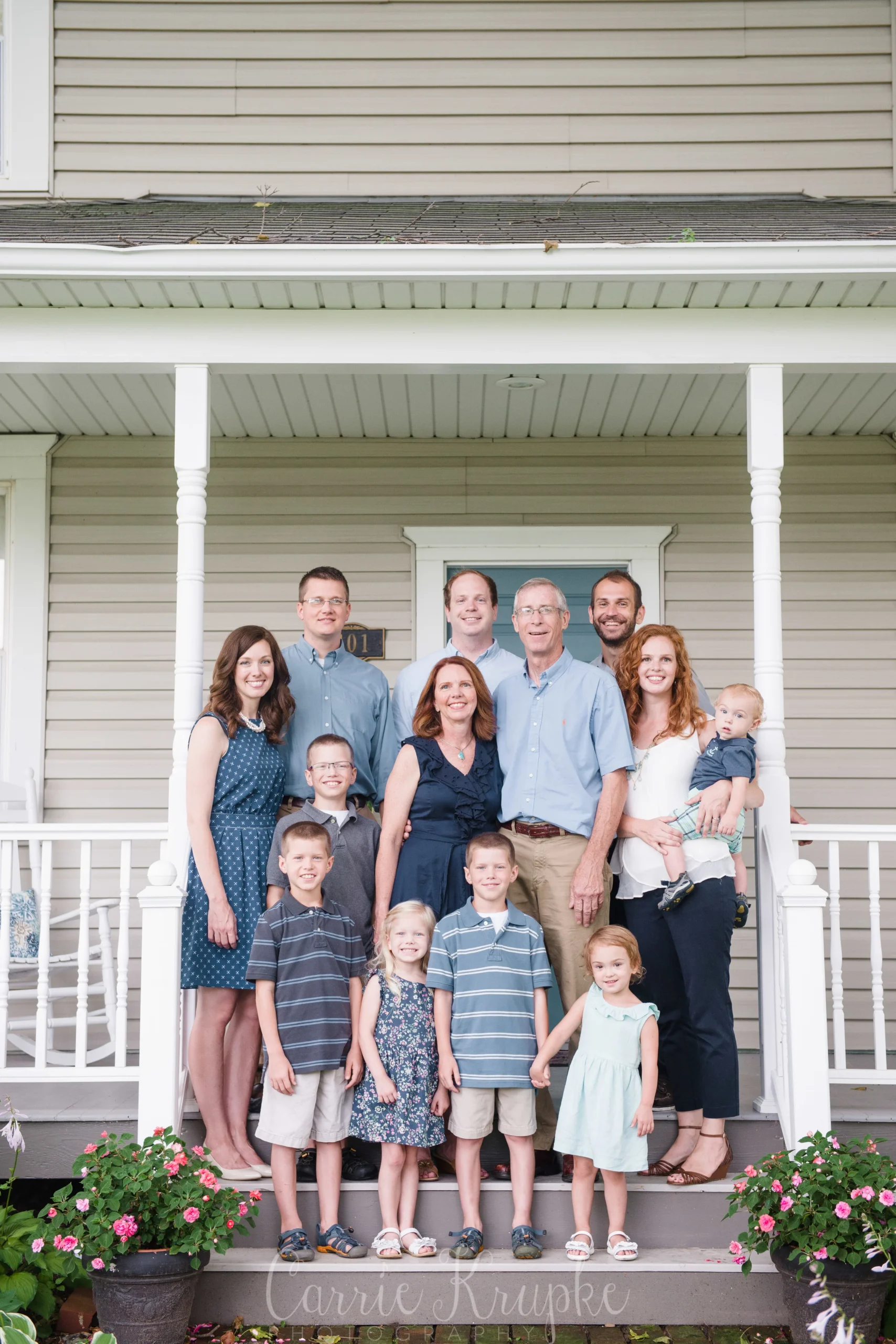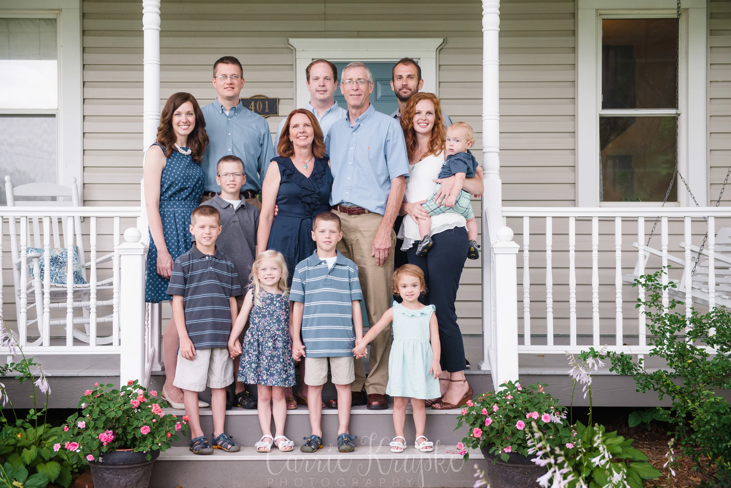 When Laura & I were talking about where to do their session, she unhesitatingly said, “Their porch. That’s just what they do.” So, we used Tom & Marlene’s beautifully landscaped yards as the backdrop and I loved highlighting “just what they do”. 🙂 We did a few of all the grandchildren with Tom & Marlene on the porch swing and moved straight to the big group photo while everyone was still happy. 🙂