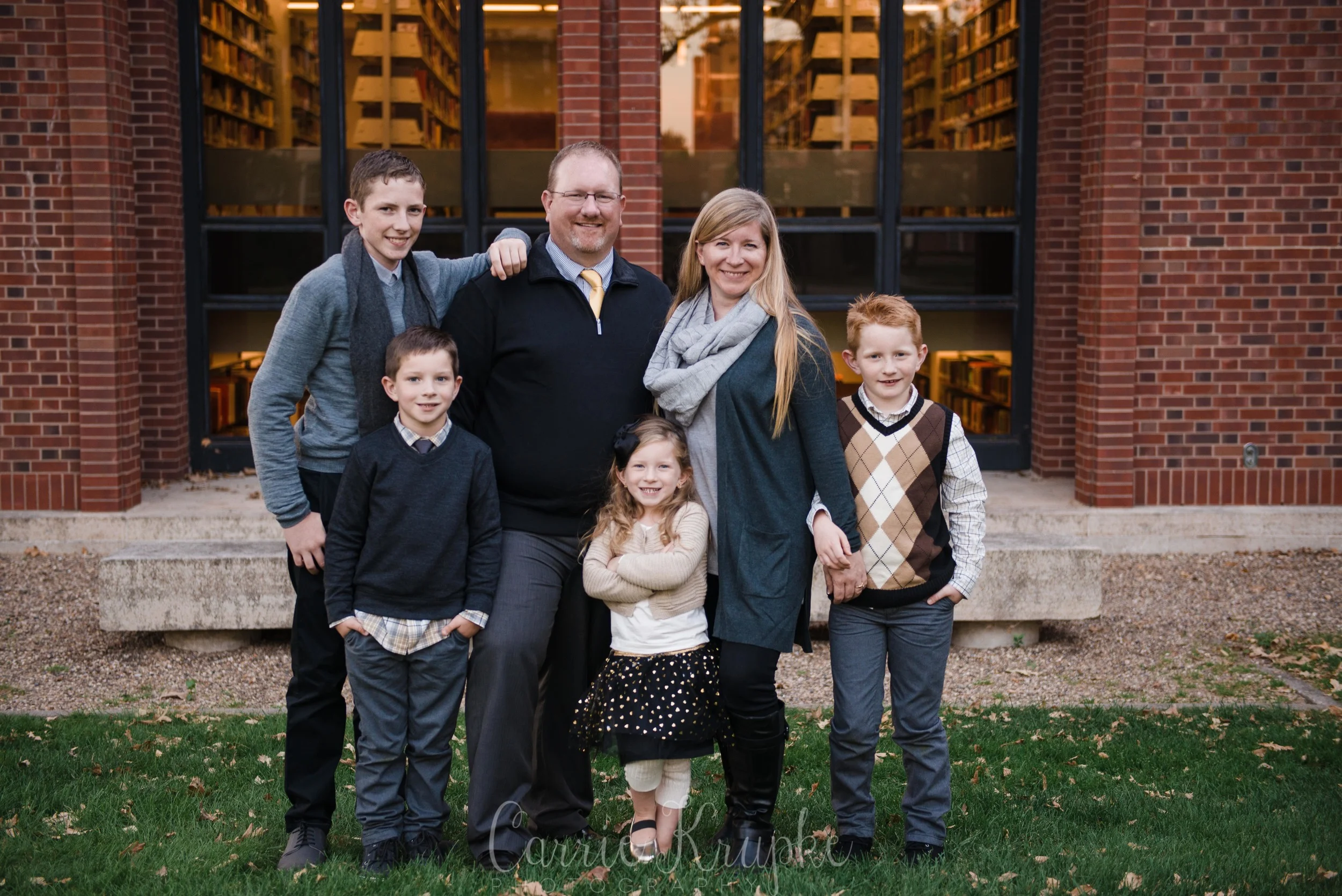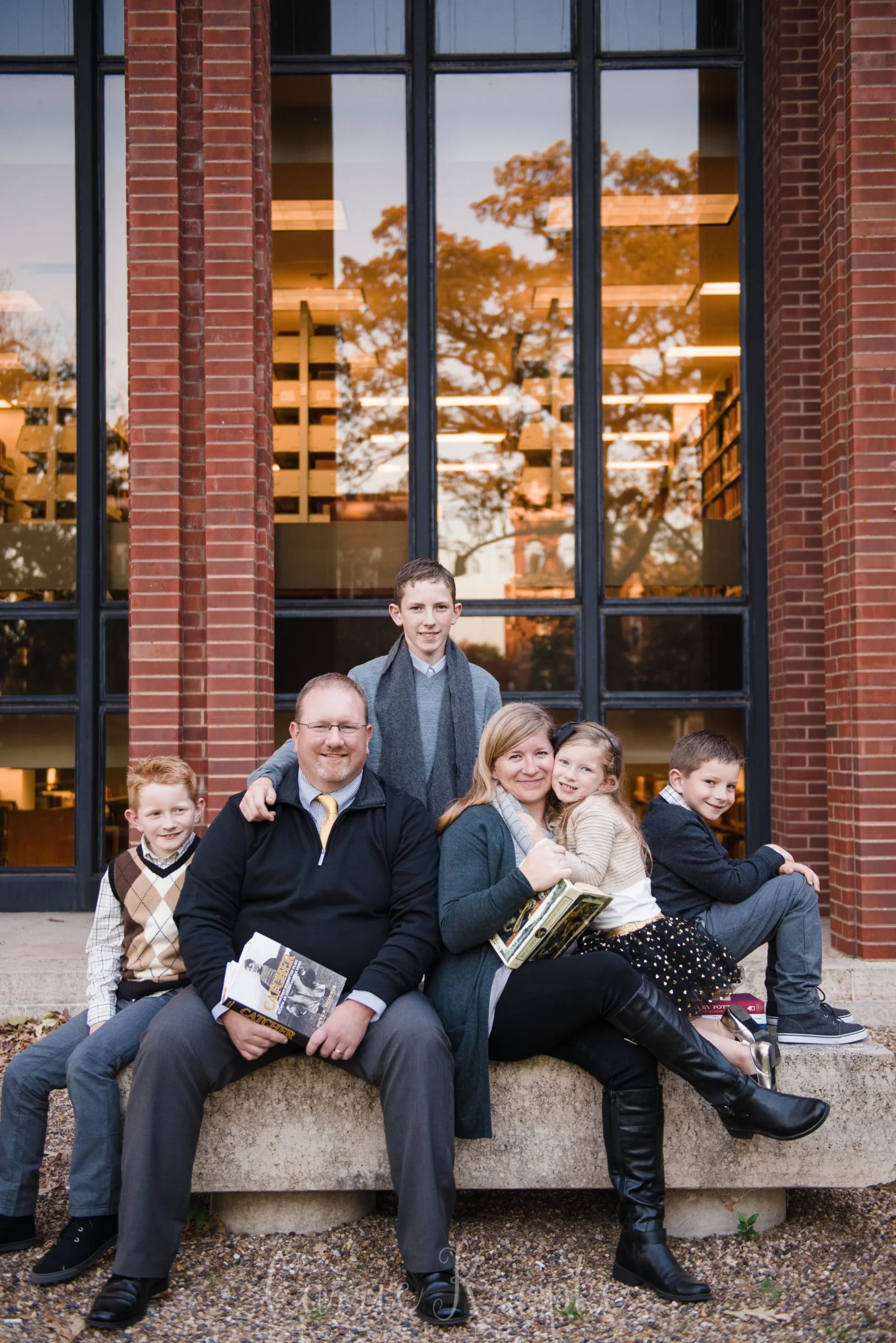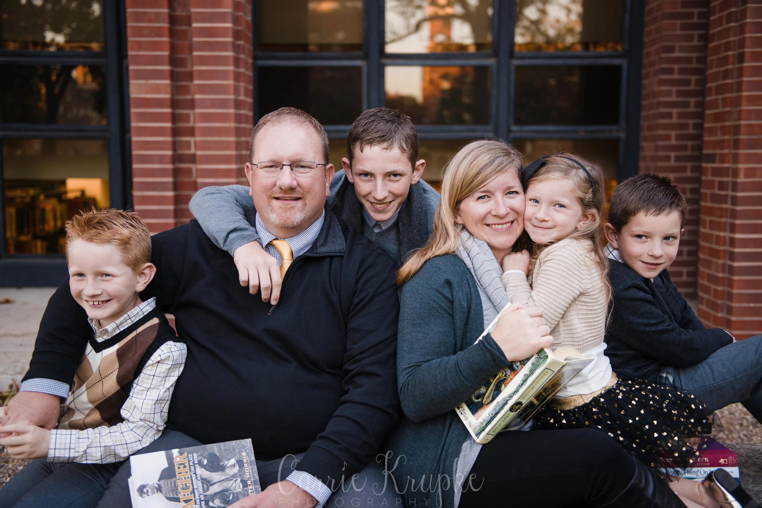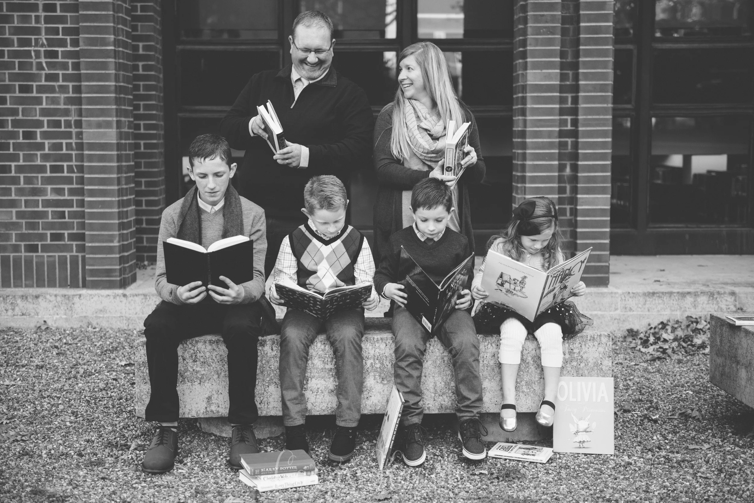 I think it’s safe to say that Twitter gave me the gift of this family session. I started calling out the @NHS_Section every time I did a Norwalk High School senior and eventually, the moderator sent me a message asking if I did family sessions. Not knowing who the moderator was, I said yes, and I have a hunch now that it was Mr. Basinger, NHS Principal. He and his wife, Beth, are English teachers by trade, though now Chris is an administrator, so I asked Beth to gather what they were all currently reading for some fun props. We met, appropriately, in front of Drake University’s library, Cowle’s Library and played with the architecture of the building, the books and their awesome-ly fun 4 kids.