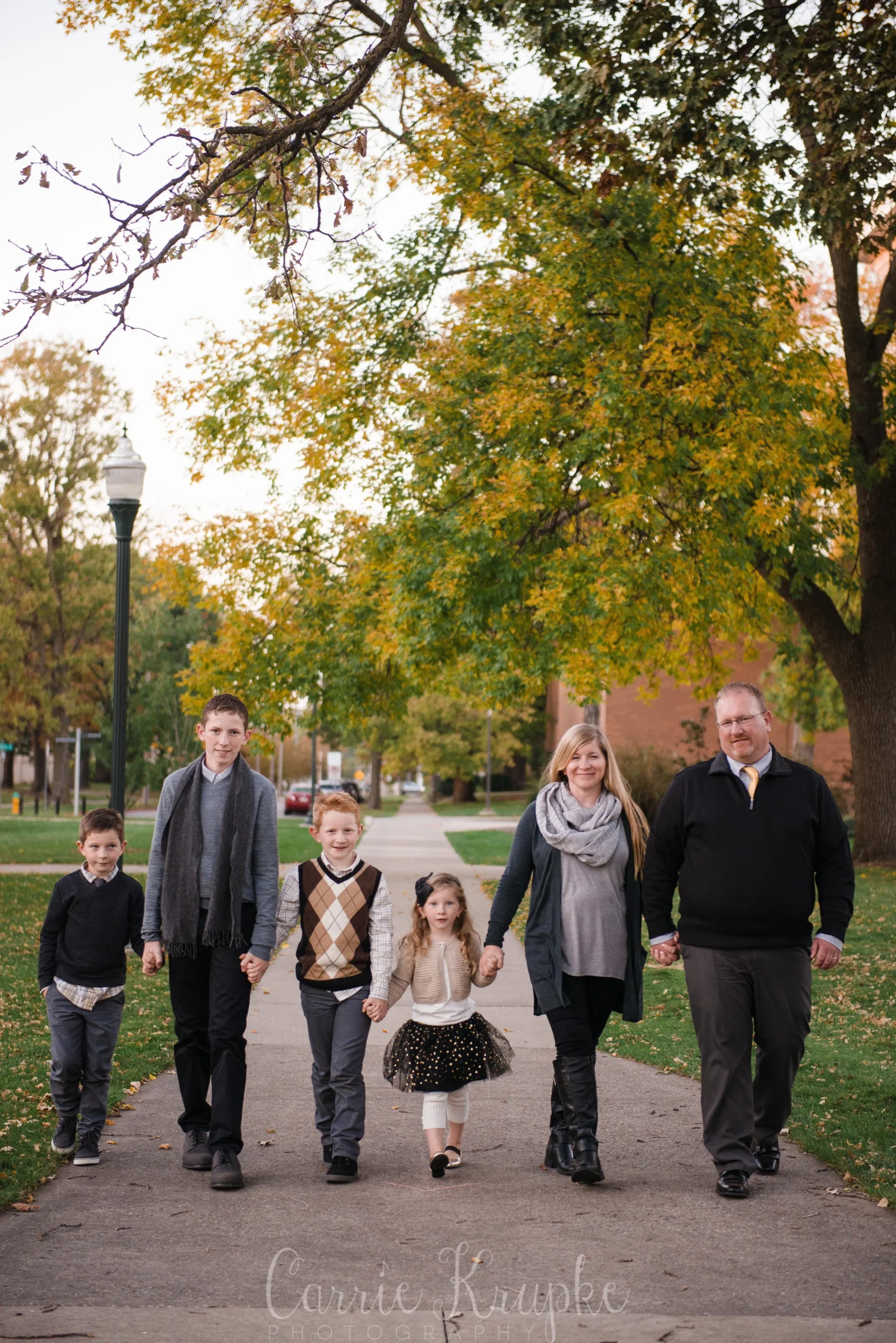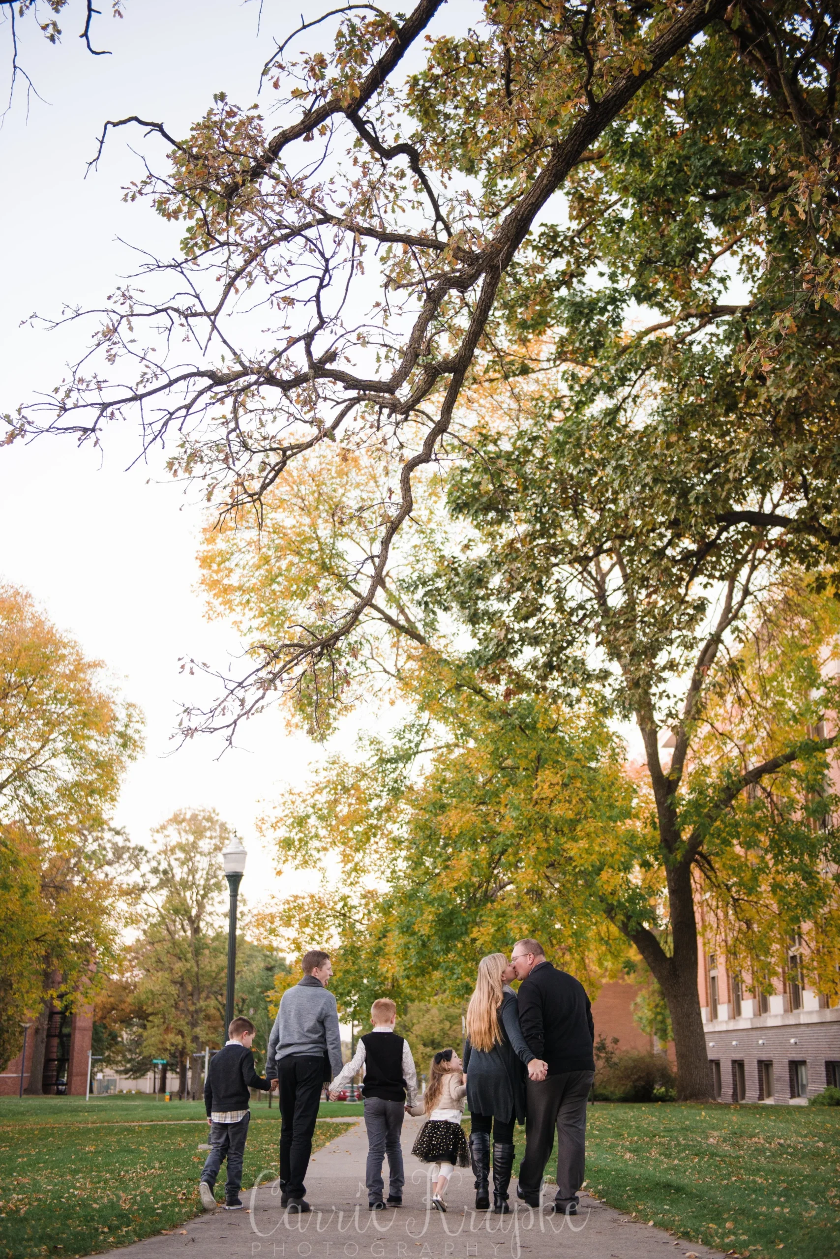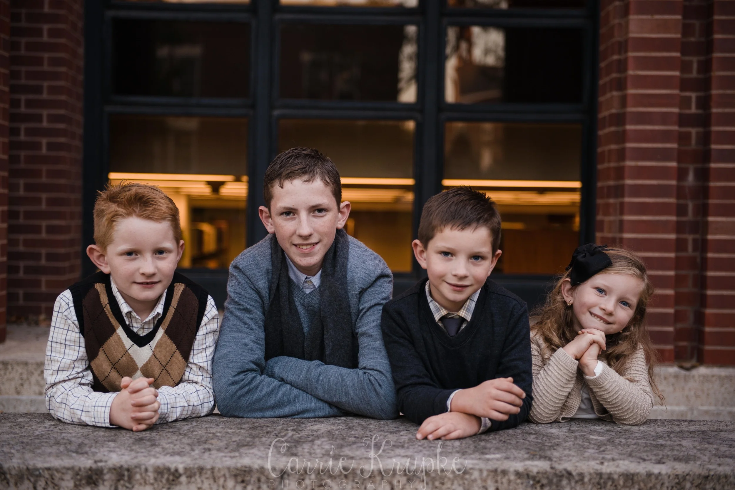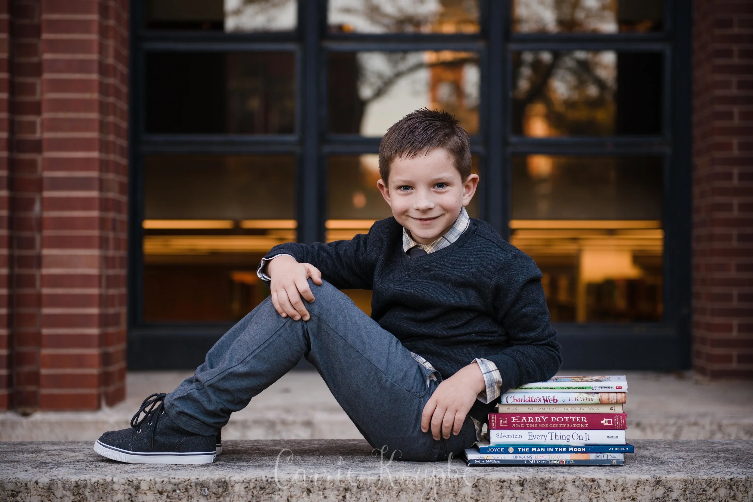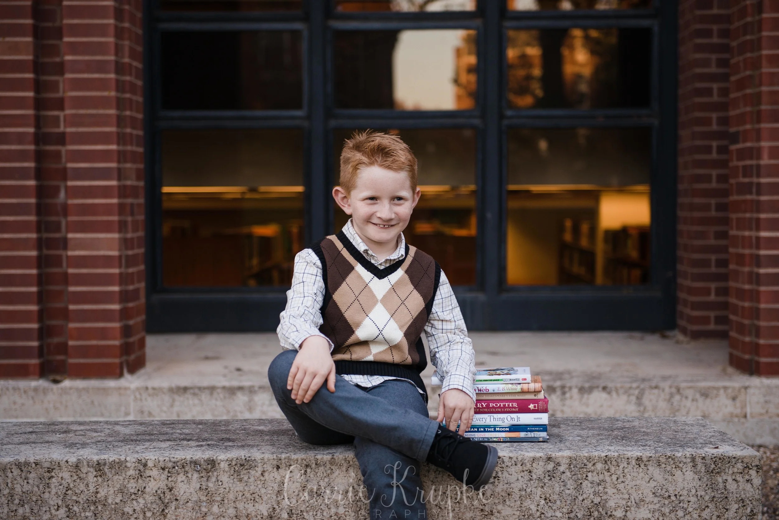 I think it’s safe to say that Twitter gave me the gift of this family session. I started calling out the @NHS_Section every time I did a Norwalk High School senior and eventually, the moderator sent me a message asking if I did family sessions. Not knowing who the moderator was, I said yes, and I have a hunch now that it was Mr. Basinger, NHS Principal. He and his wife, Beth, are English teachers by trade, though now Chris is an administrator, so I asked Beth to gather what they were all currently reading for some fun props. We met, appropriately, in front of Drake University’s library, Cowle’s Library and played with the architecture of the building, the books and their awesome-ly fun 4 kids.
