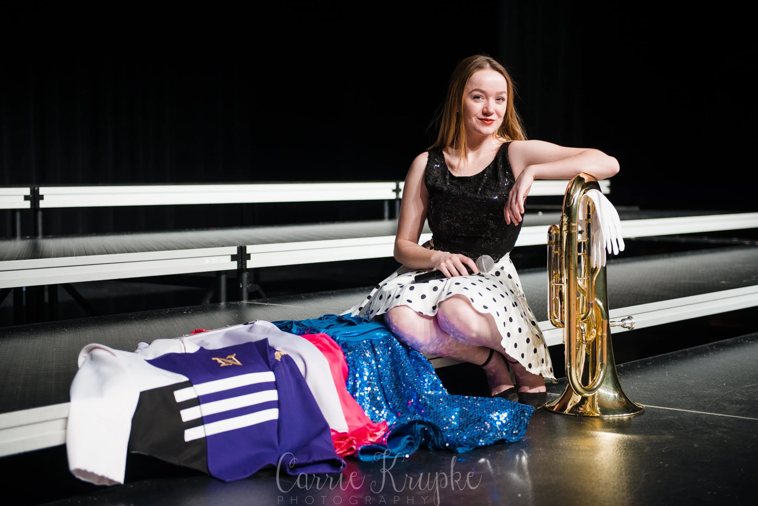 I can’t believe we started this process a full fledged EIGHT MONTHS AGO and we’re wrapping up Alli’s fourth senior session to represent all the seasons of the year. That whipped by so stinkin’ fast! We did her other three sessions outside, soaking in the spring sun and blooms, chasing the light with sparklers, and relishing the changing colors of fall. So, with the weather a mere 10 degrees outside, we opted to stay indoors and represent the performance aspect of her high school career-highlighting show choir with this season’s dresses, a poodle skirt from this fall’s high school musical (Grease, where she played Sandy), and her marching band jacket, gloves, gauntlets (Drum Major), and euphonium. I love that this spunky girl holds her own in the low brass section with all the boys!