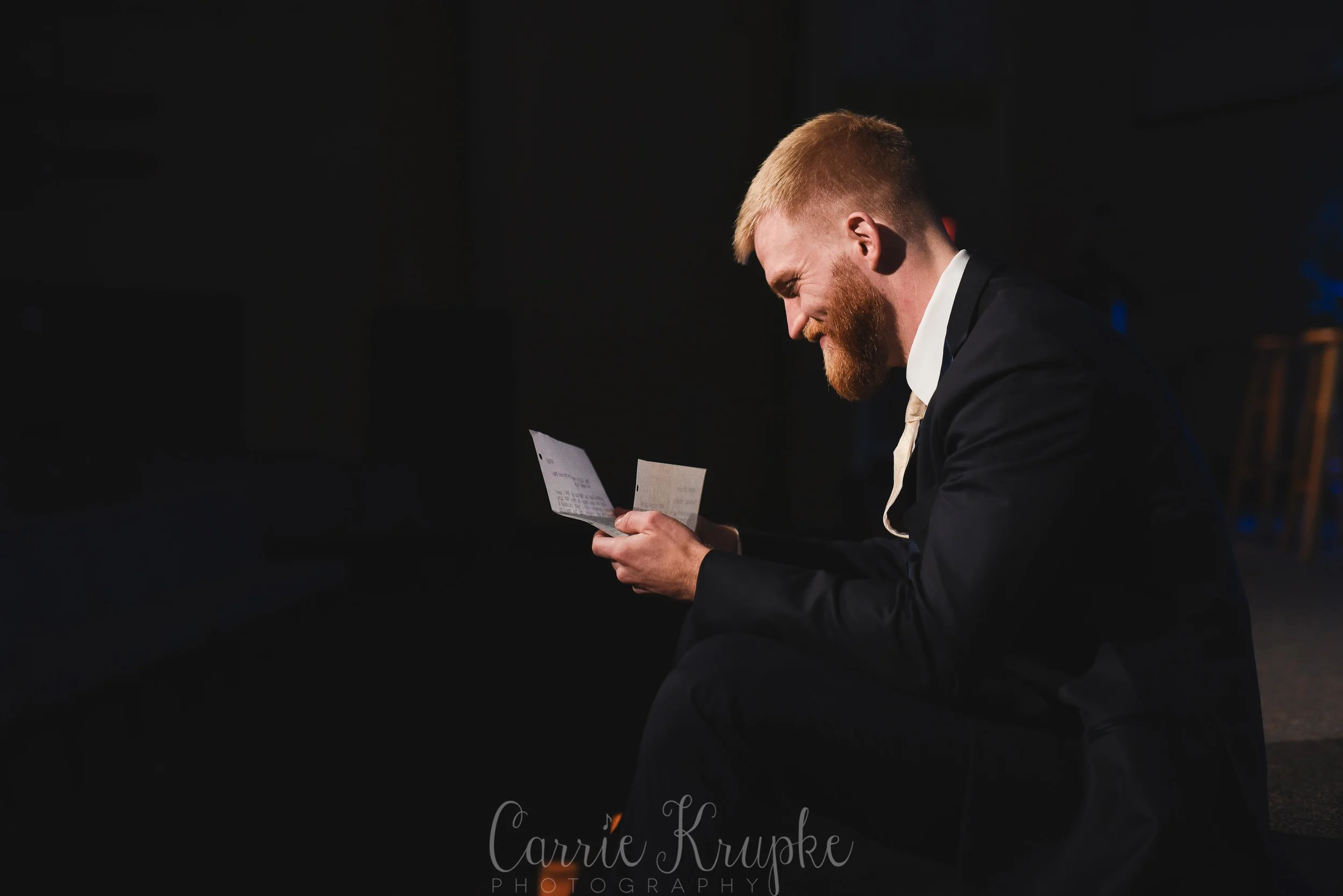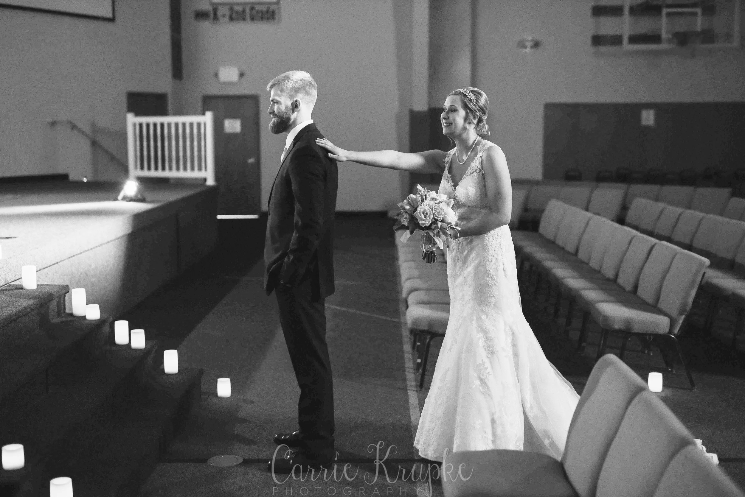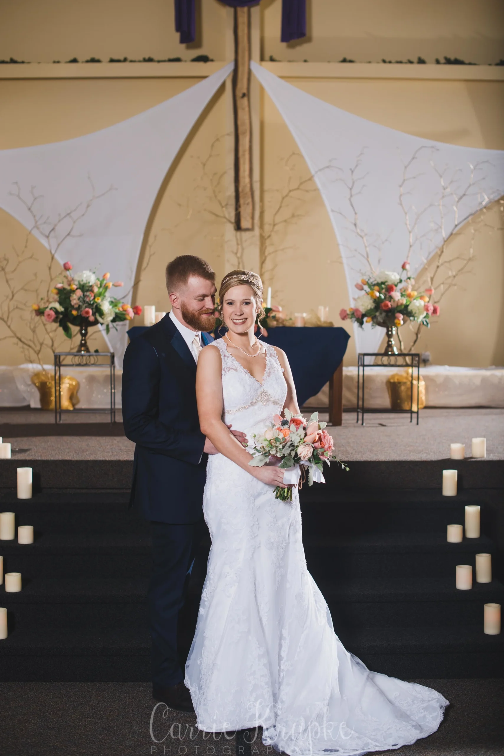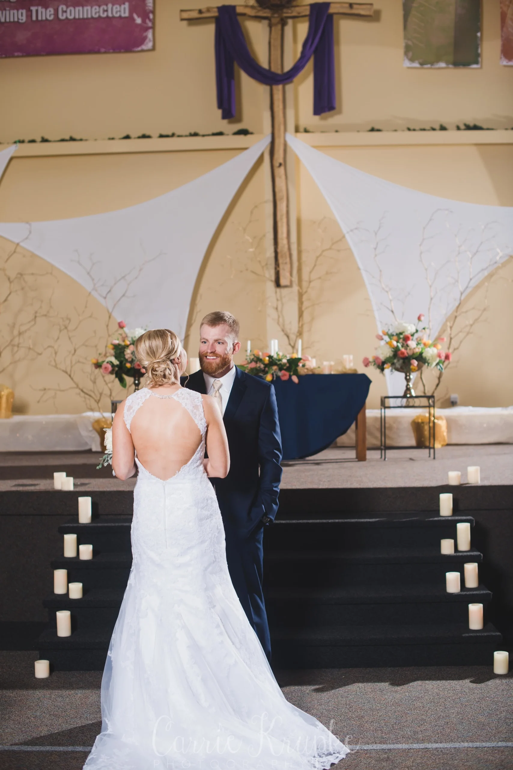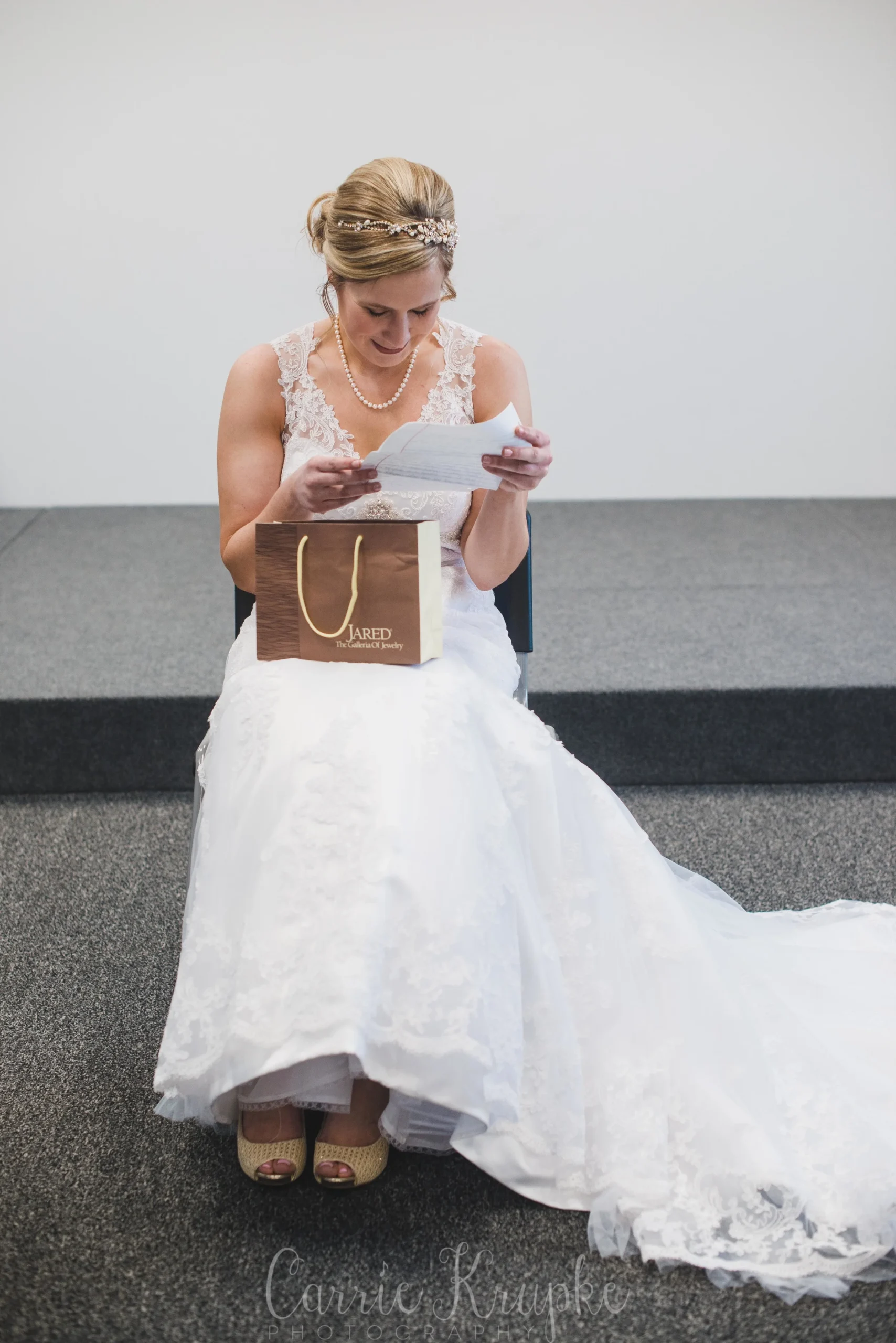 “He really did notice me freshman year in marching band.” Kelsi dabbed at the tears coming down her cheeks while she read Andrew’s letter to her before their First Look. As she sat and read Andrew’s sweet thoughts to her about their relationship’s history beginning in high school to spending the rest of their lives together, he was doing the same in the sanctuary. They donned the gift the other had given (Kelsi put on pearl earrings, Andrew a handsome watch) and melted into each other’s arms, a fitting shelter from the rain drops descending outside.