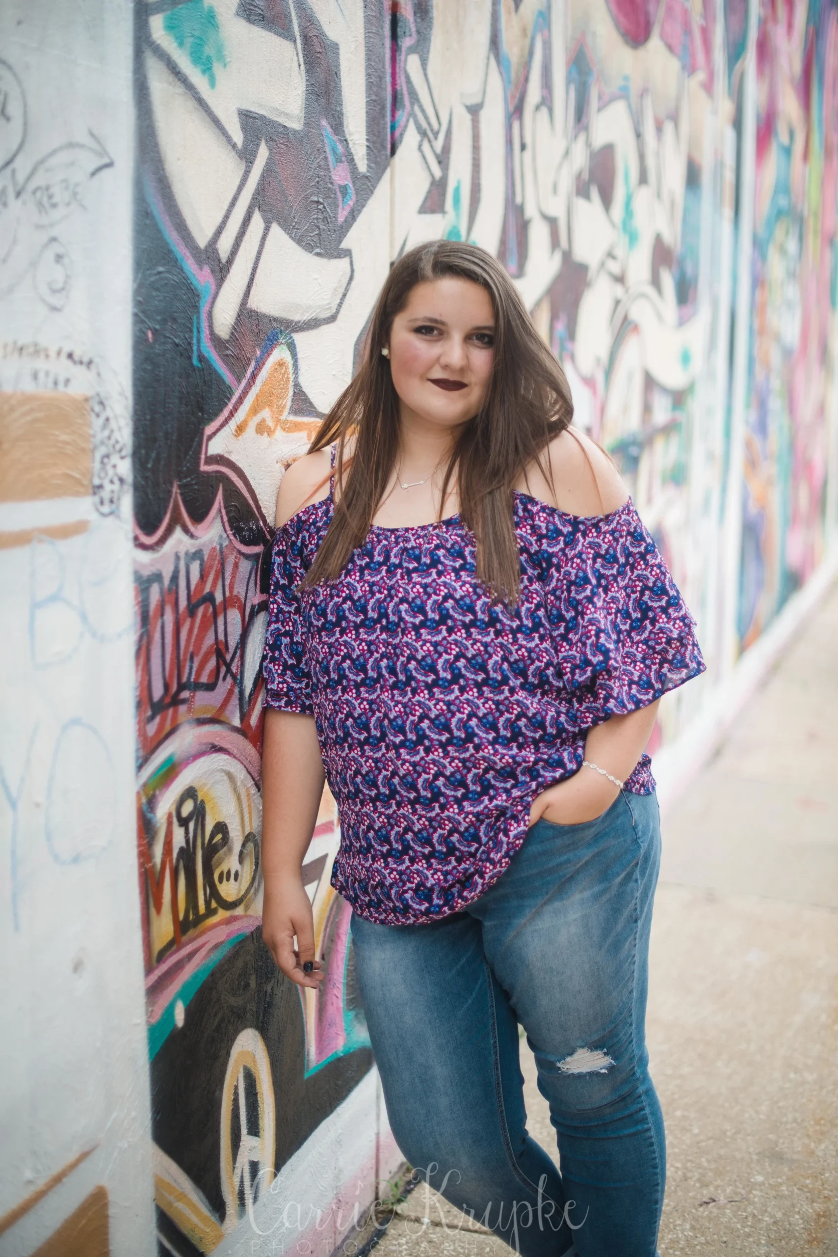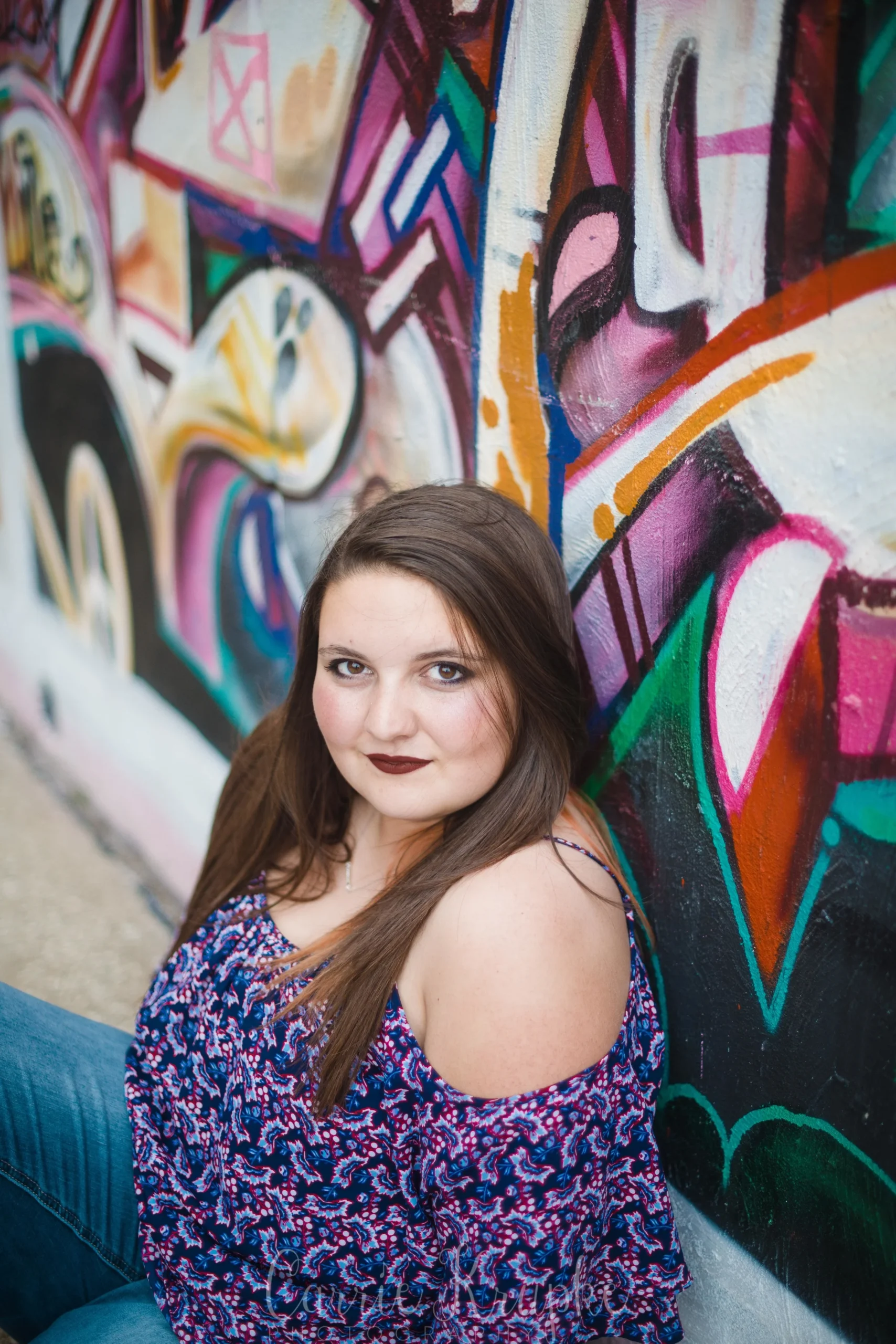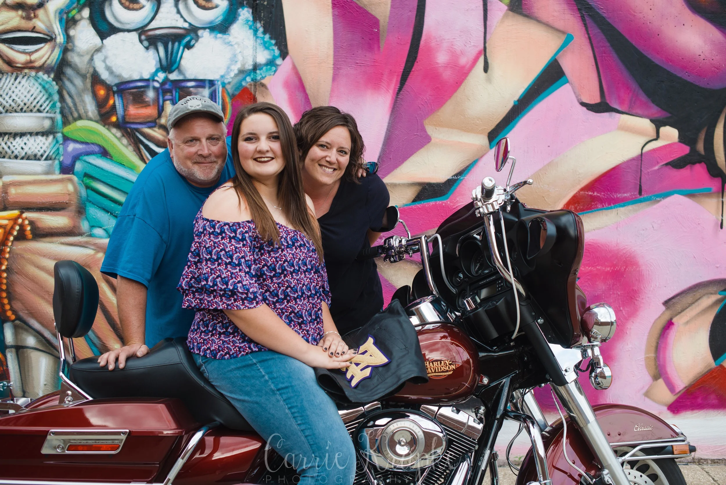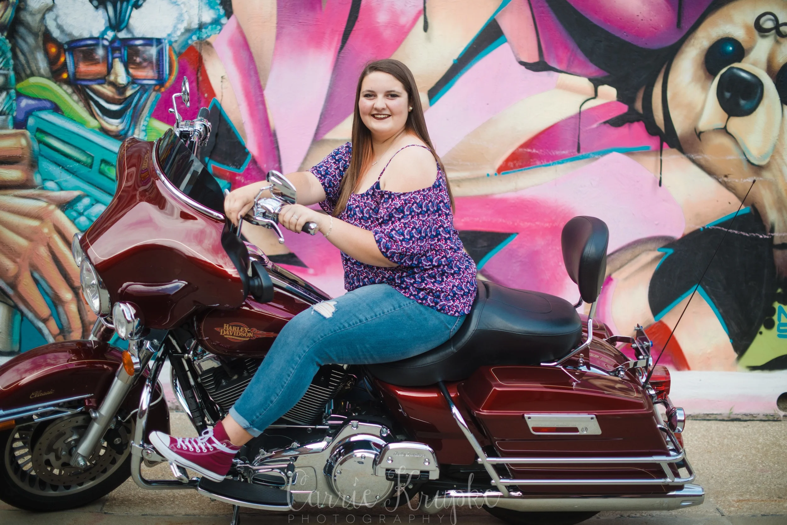 I am so thrilled to be knee deep in senior photos for the Class of 2017! Every session has been so different and I always learn something new about the student, their family, a particular hobby they enjoy etc. Case in point: I had no idea that Ms. Natalie was into Harleys! Her mom and step-dad each have one and Natalie looked super comfortable as she sat astride one downtown Des Moines last week for our time together. The colors she wore, the color of the Harley and the mural behind were just awesome to put together. Who knew that the shy and quiet 6th grade clarinet player I saw in middle school would assume this sassy, biker-chick, fun personality?!