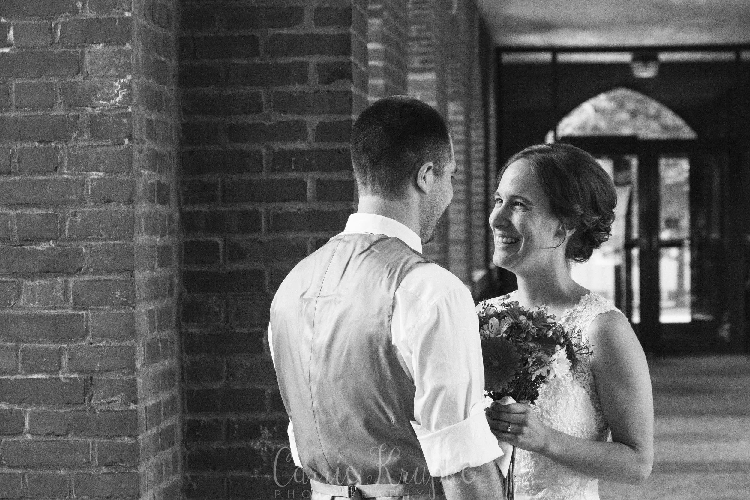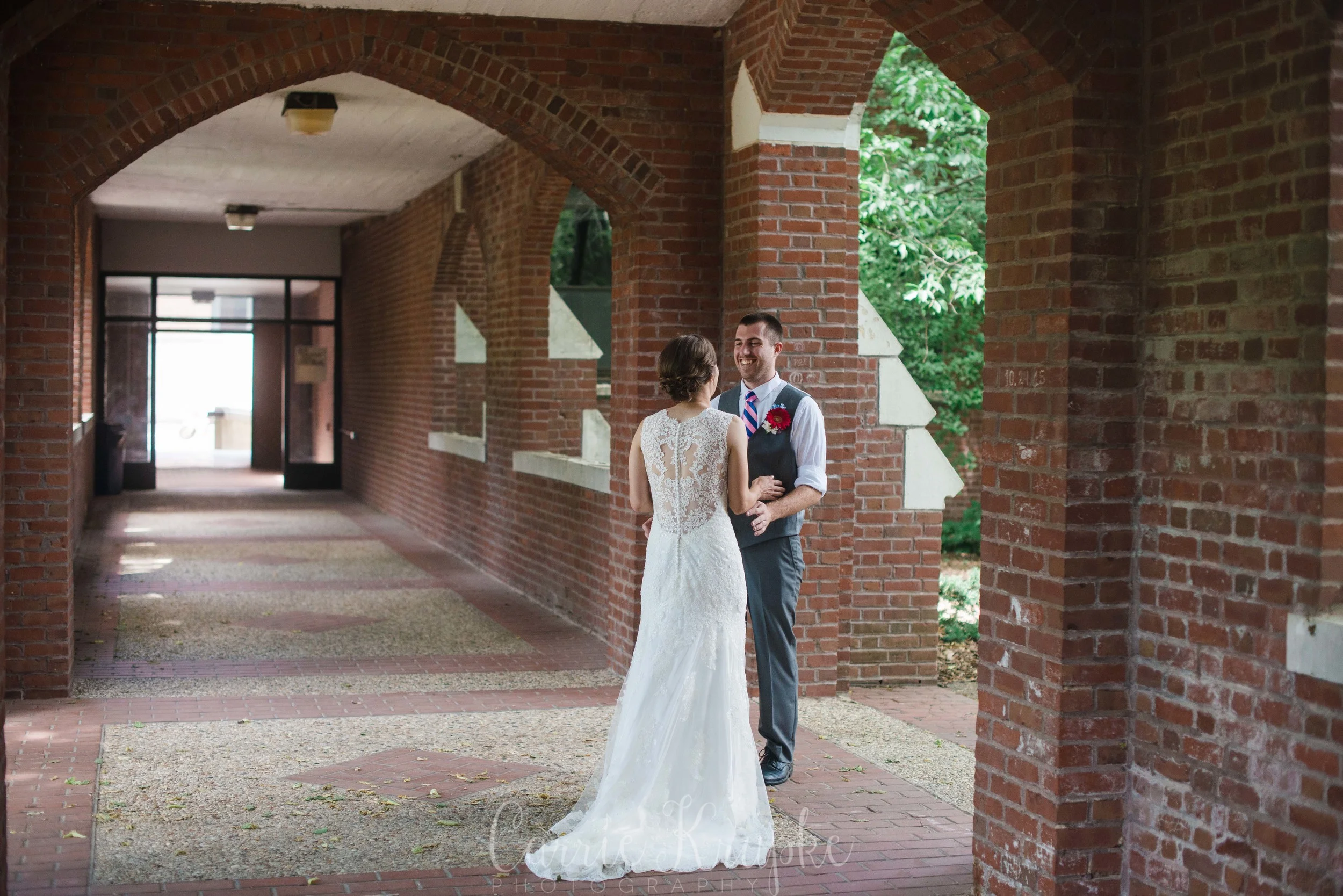 I’ve not ever had a bride and groom do their First Look like this: the location Carrie & Mike had selected for this part of their day has beautiful architecture that lent itself well to their idea. They wanted to be walking towards each other, but not seeing each other until they’d turned the corner. So, heads down, they approached from their perpendicular locations and met in the middle at the intersection. Though my second shooter snuck a shot of Mike trying to peek….;)
