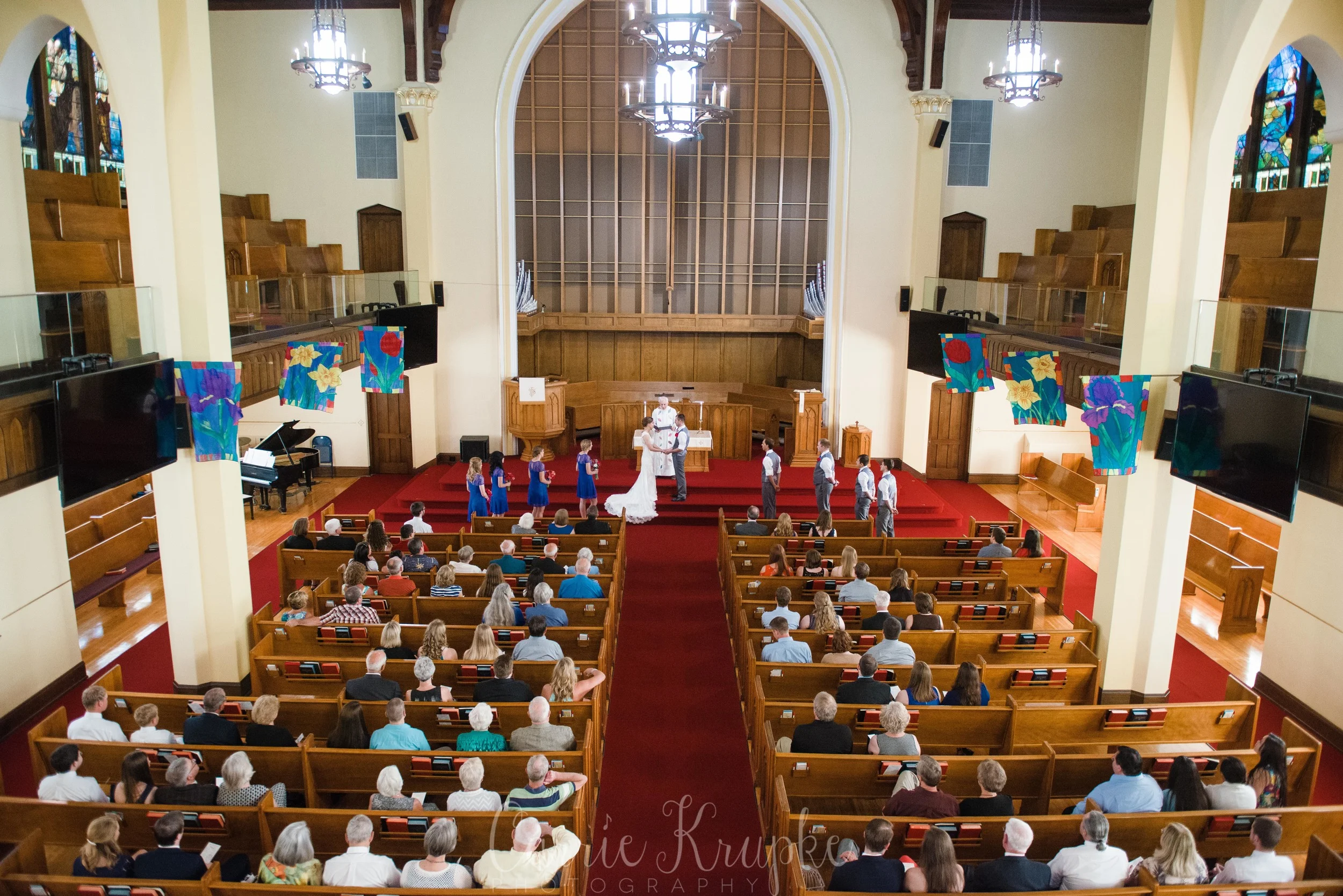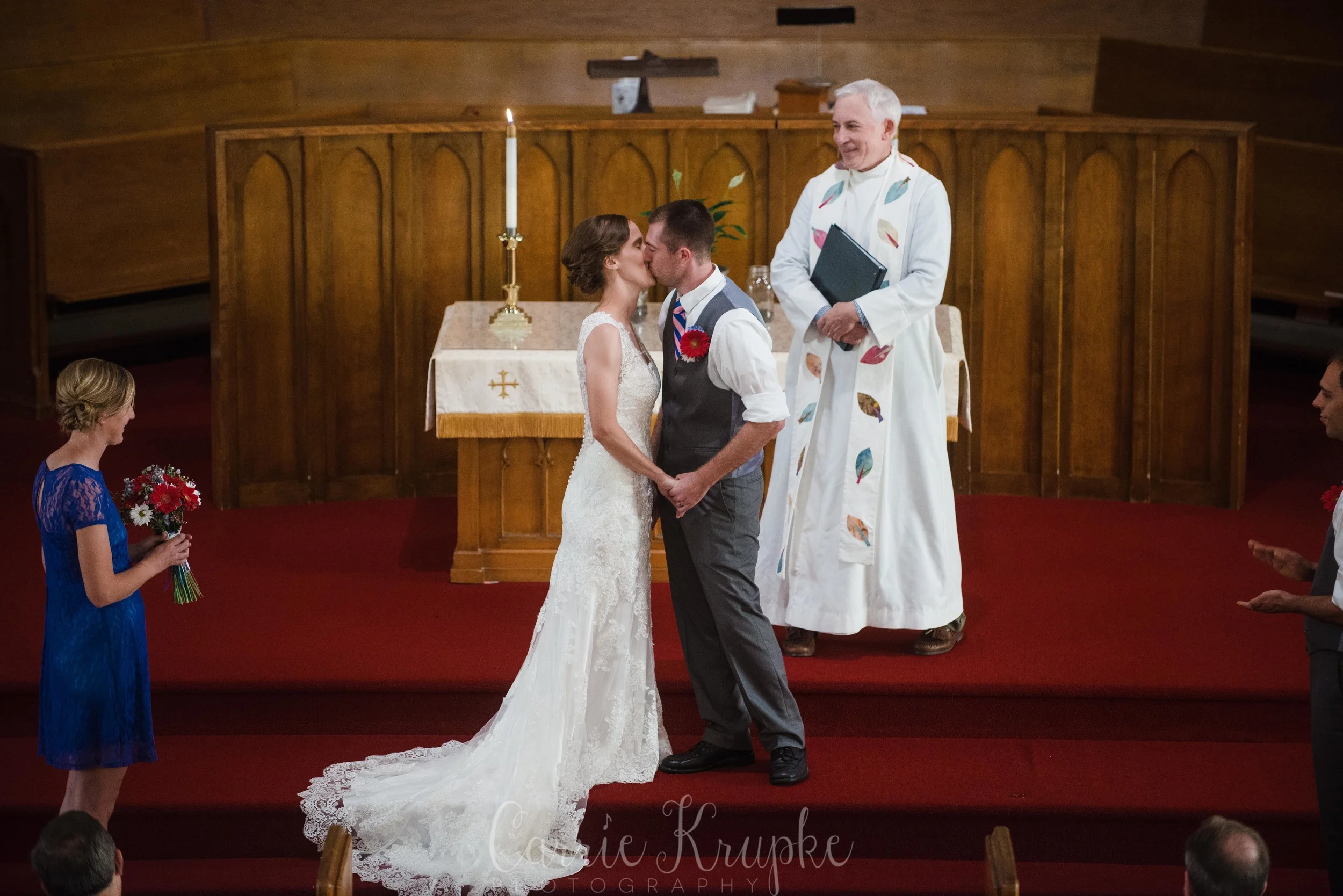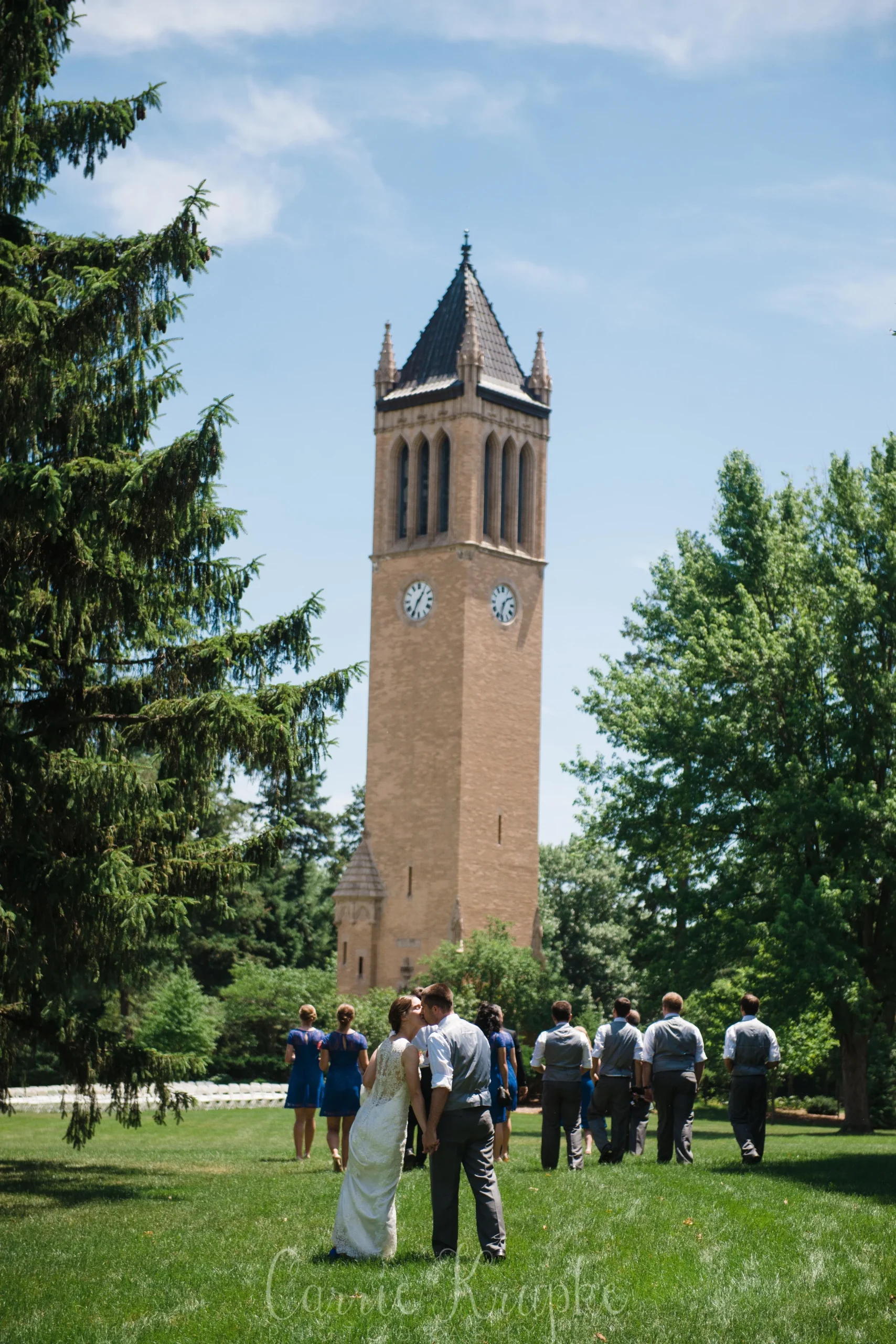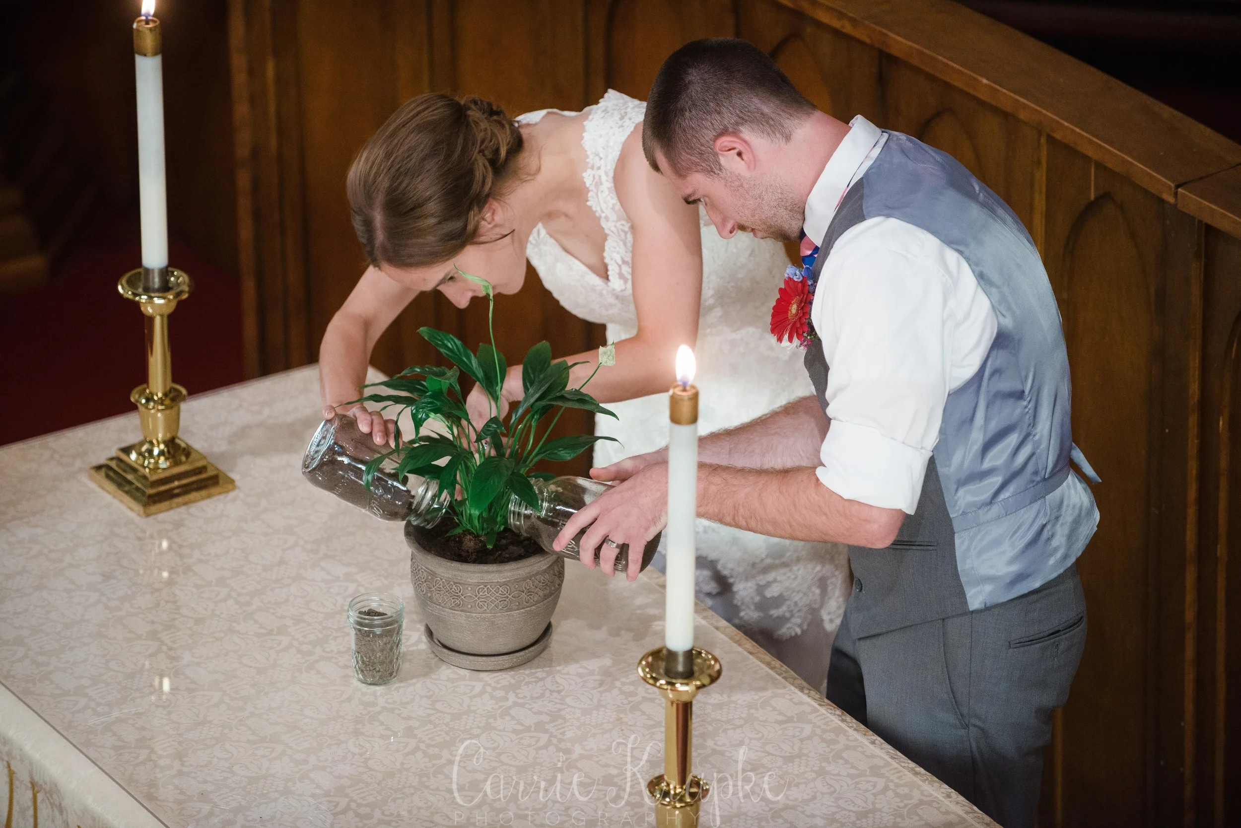 I LOVE the churches these Demmon sisters choose to get married in!! Old and gorgeous woodwork throughout-incredible indoor lighting provided by scads of stain-glass windows. But the beauty of the location can’t compare to a bride’s smile as her dad prepares to give her away…Also true to Demmon sister form, they come up with something different for their “Unity Candle” ceremony. Carrie & Mike brought dirt from their hometowns and dirt from Iowa State’s campus where they met to combine all those granules in a peace lily plant. I sure hope one of them has a green thumb so it lasts forever. 🙂