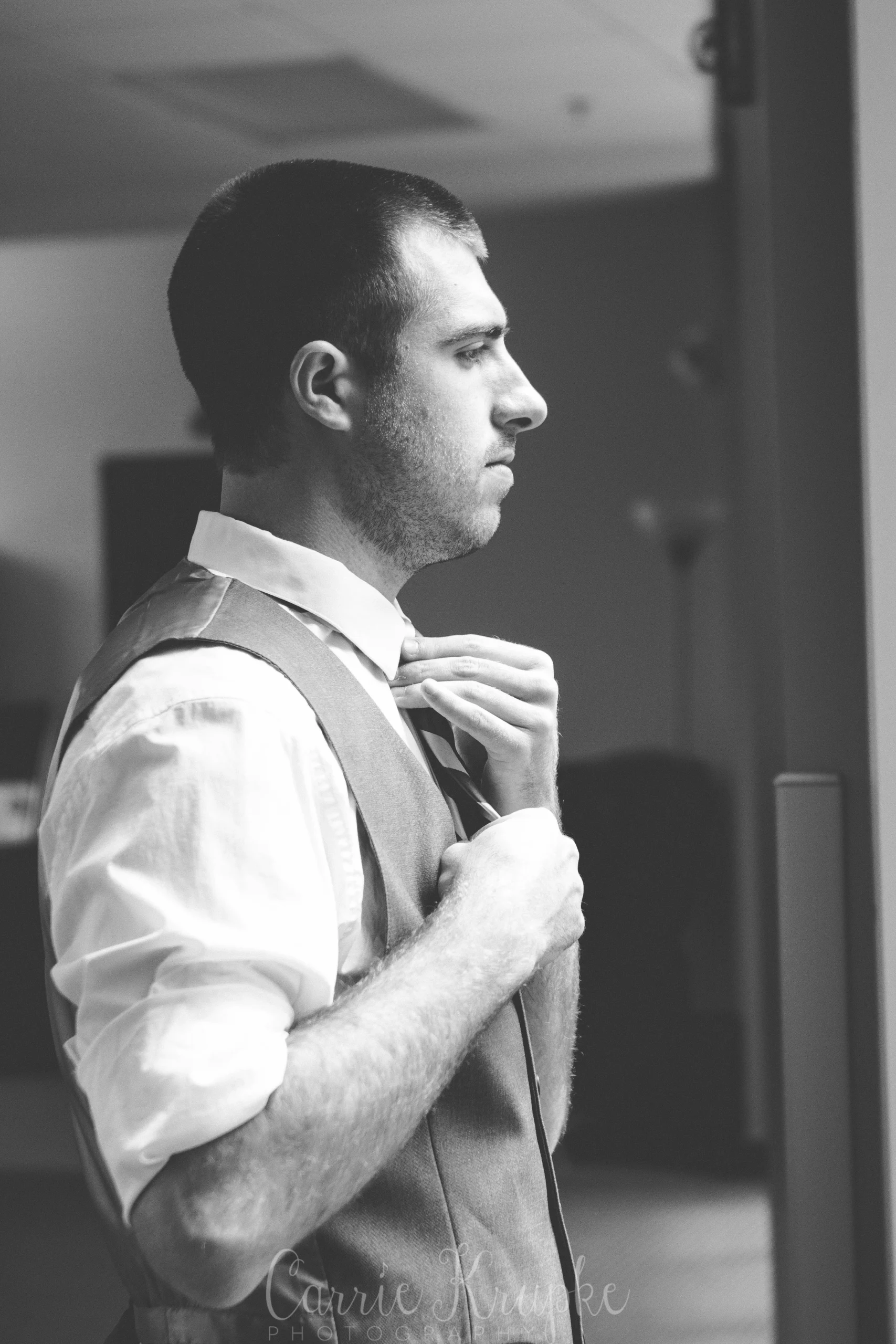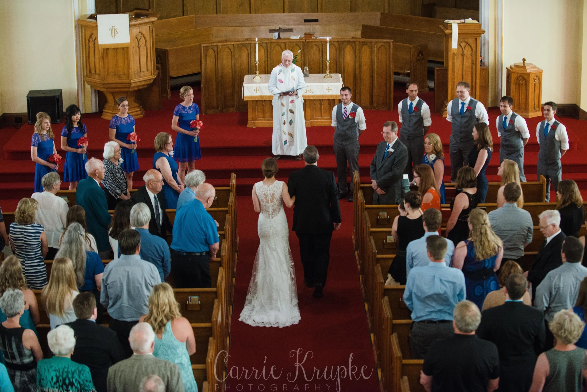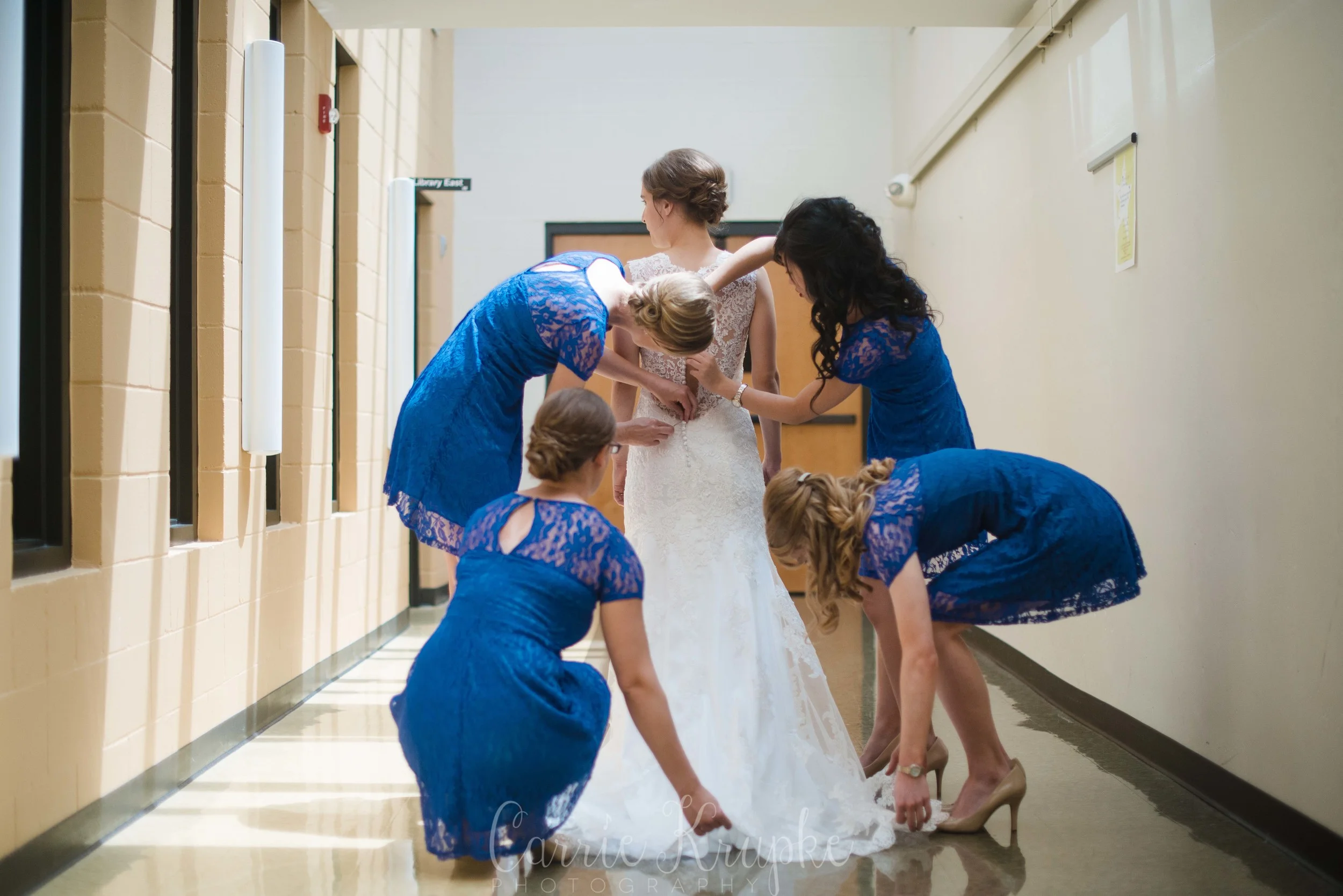 In the church where her parents met while attending Iowa State, Carrie and Mike prepared to see each other in their wedding attire. I’d photographed Carrie’s family at her older sister’s wedding two years ago and thought it super sweet that a similar color played throughout both of their weddings-a royal, stately, blue. True to Carrie’s personality though, she added a splash of pink. Calmly, with some scattered laughter, they were surrounded by siblings and best of friends.