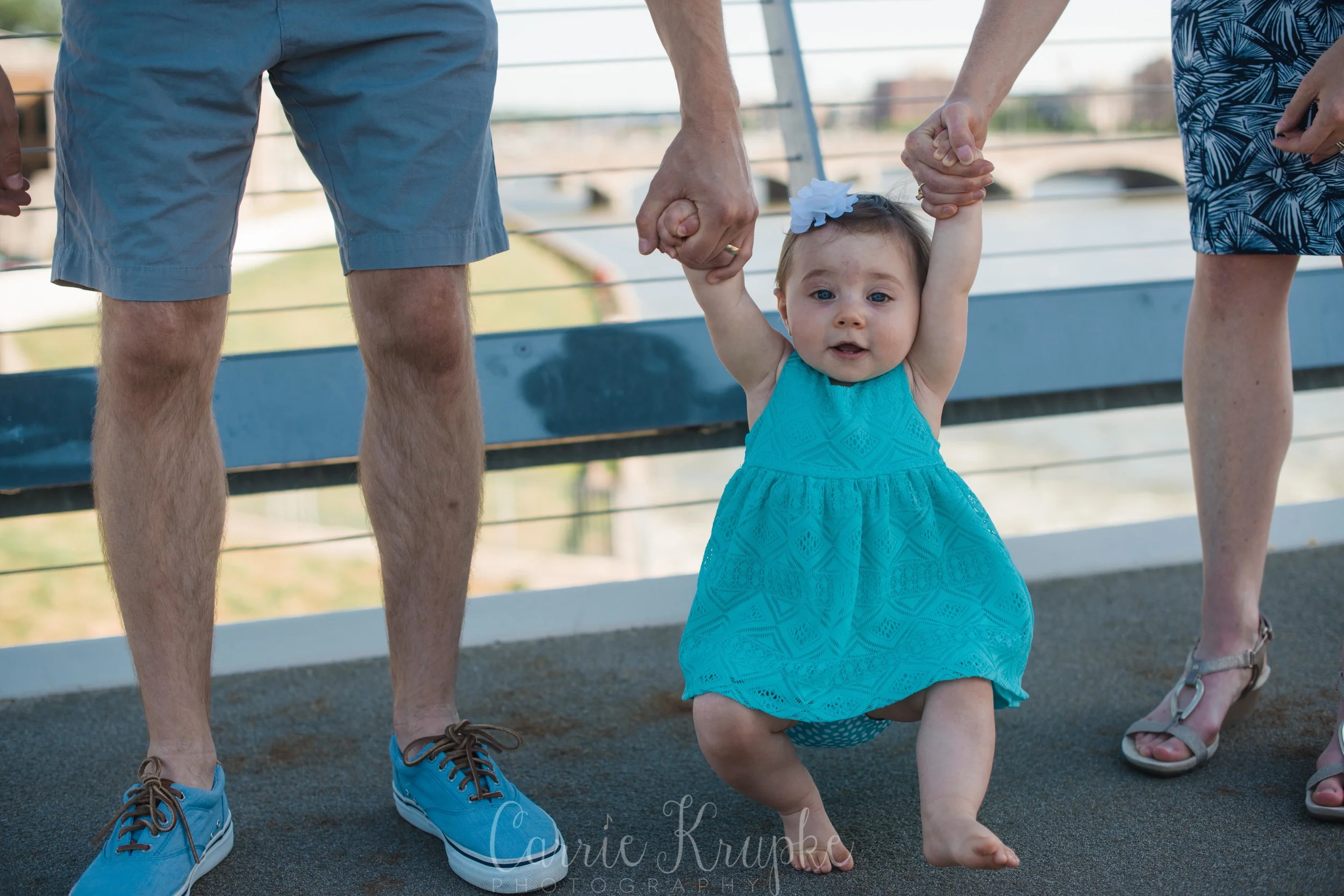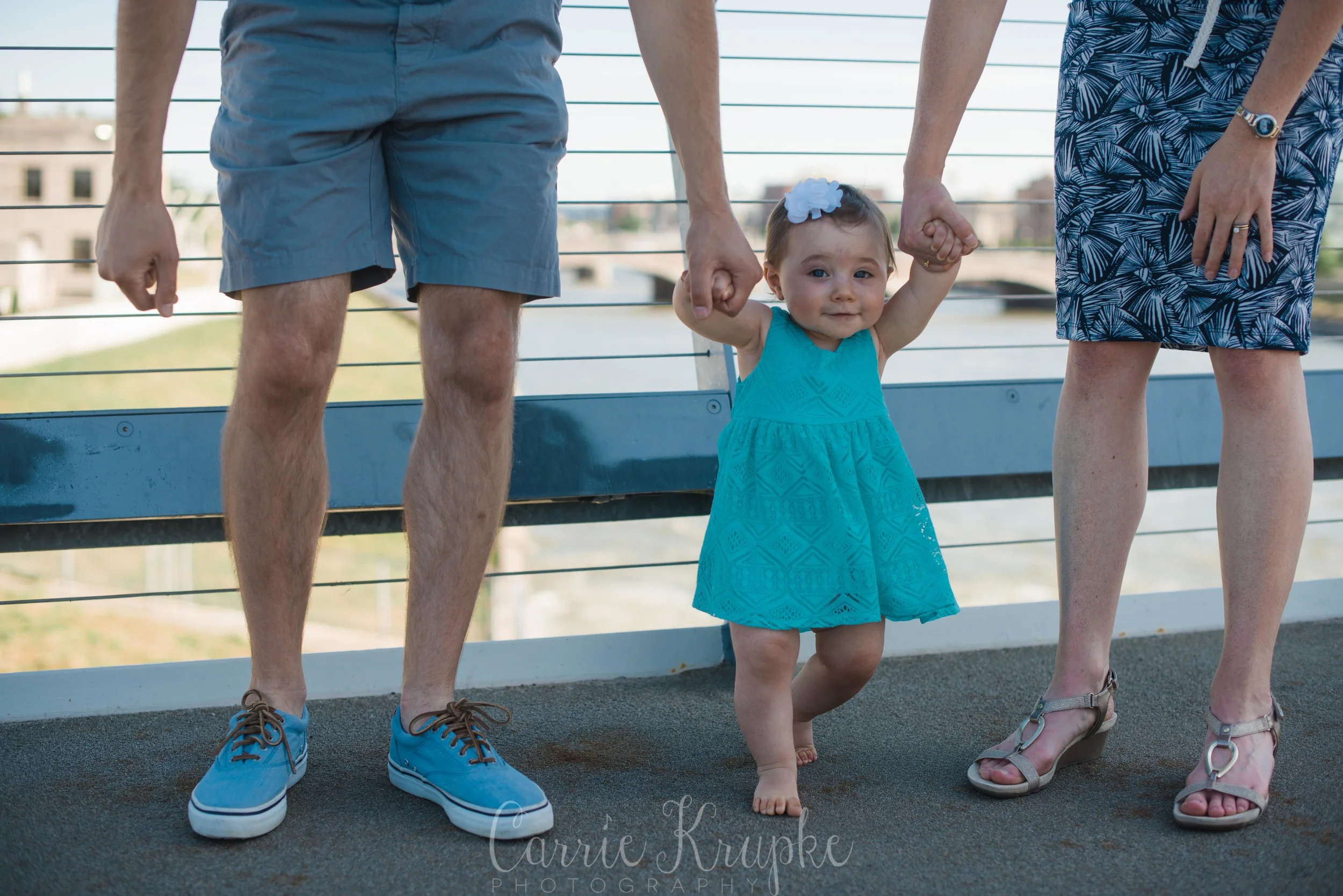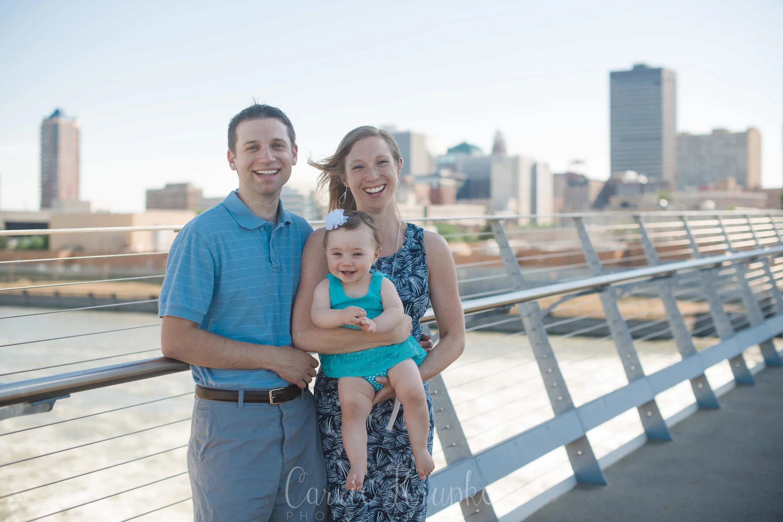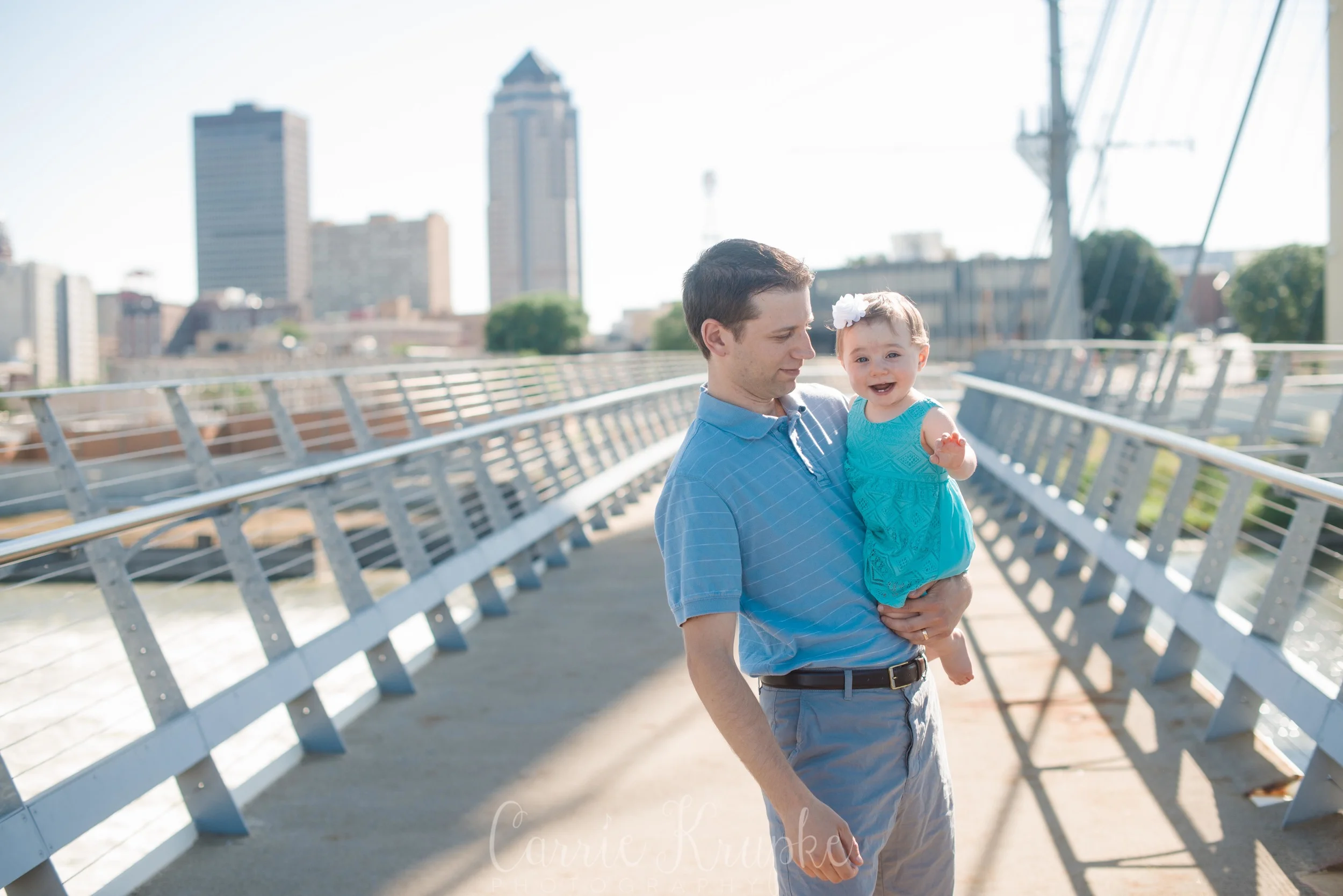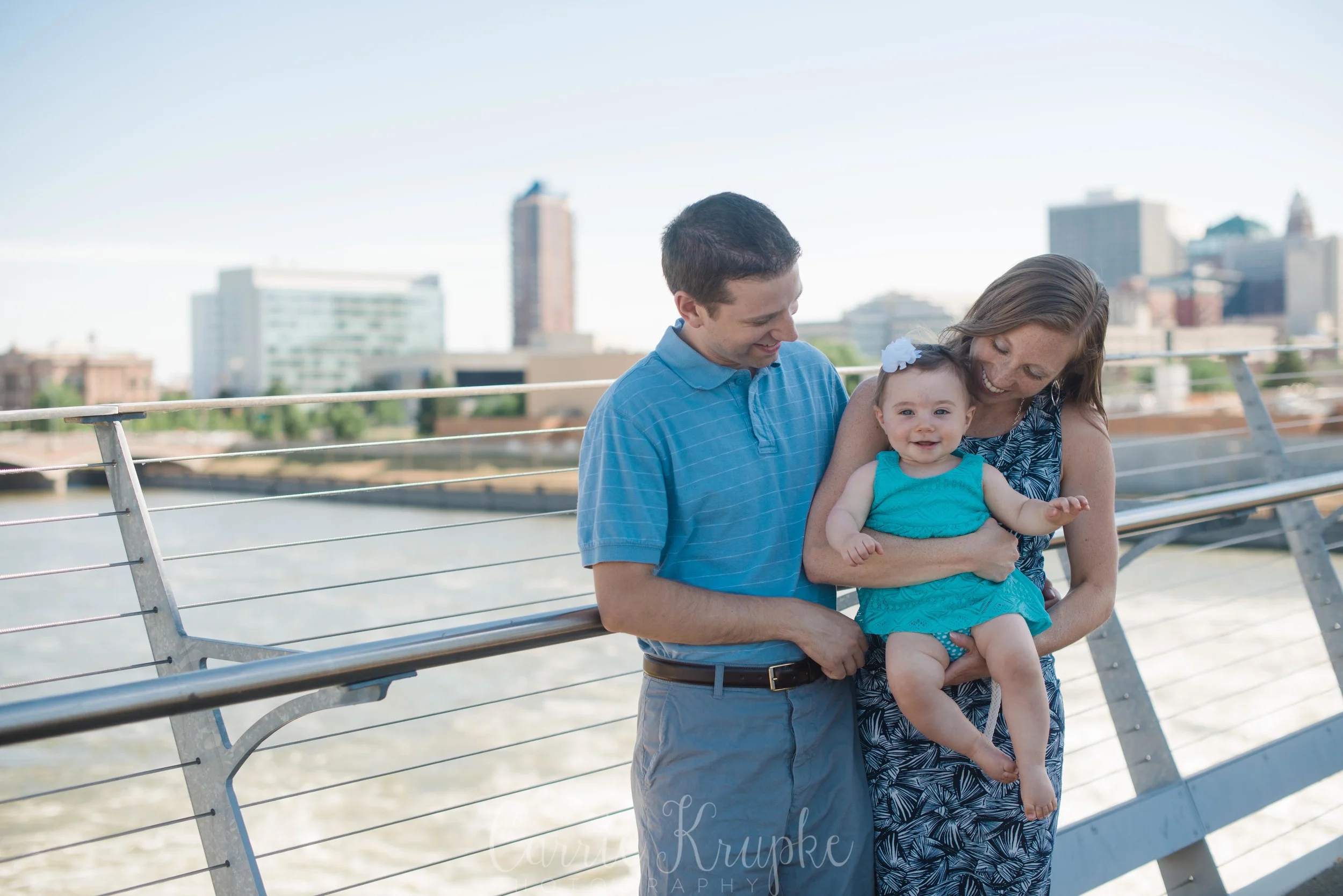 No one would’ve guessed by her newborn session that Ms. Ellie would be this happy, nay, ecstatic in front of the camera. Needless to say though, I’m thoroughly enjoying it. 🙂 Steph, Andy, Ellie and I met on Des Moines’ riverwalk bridge for a great view of downtown, with only occasional odd smells breezing by. (Side note: why do rivers smell weird?!) 🙂