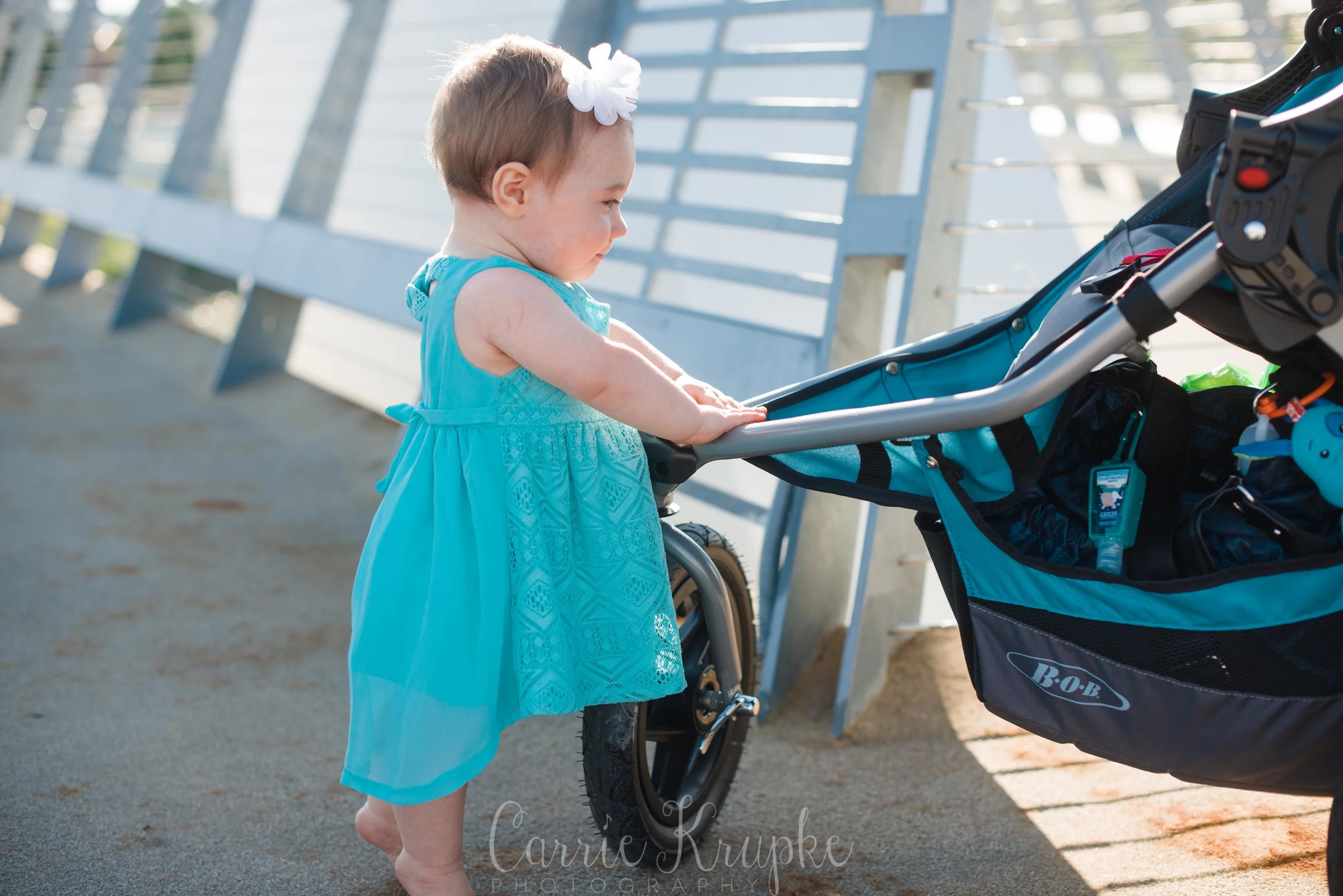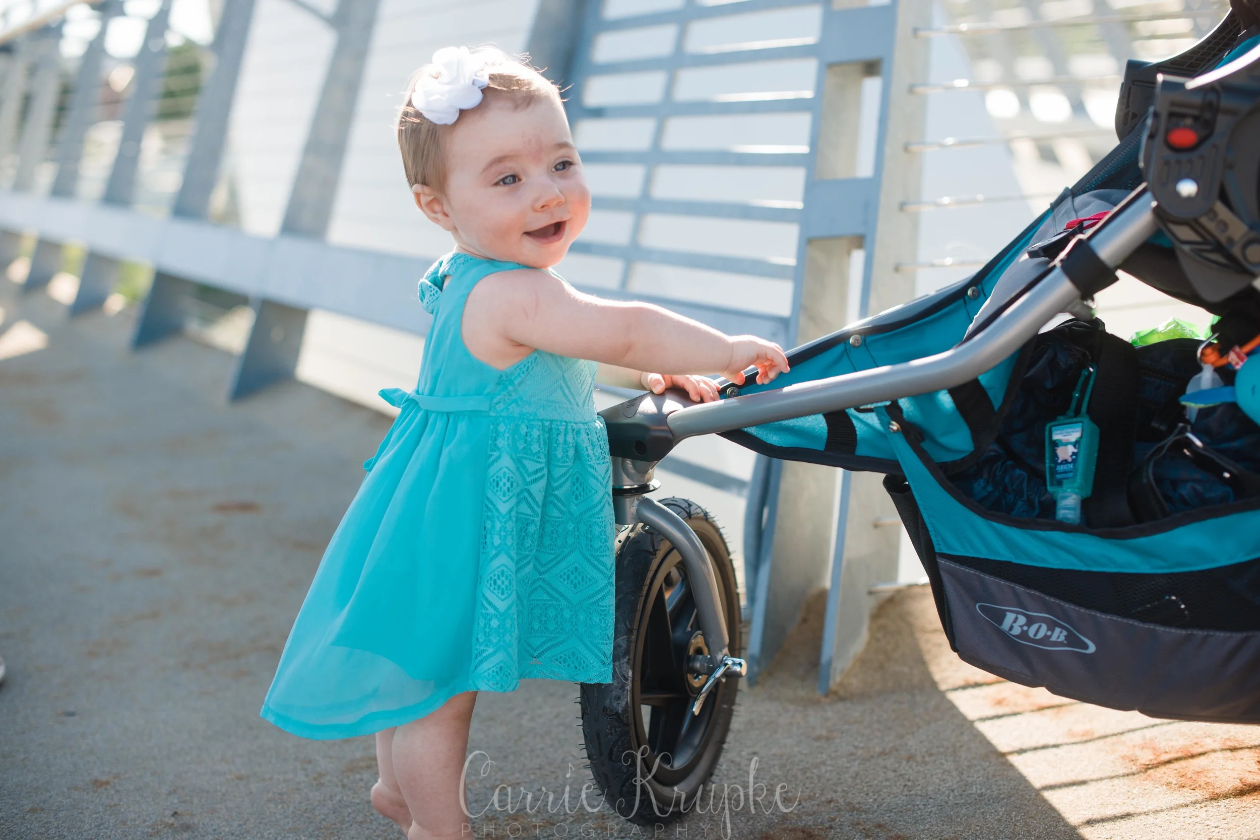 Ellie’s mama is so fit and walks/runs all the time, so it was fitting to mark Ellie’s 9 month “pulling up on furniture” stage by having her pull up on the stroller. 🙂