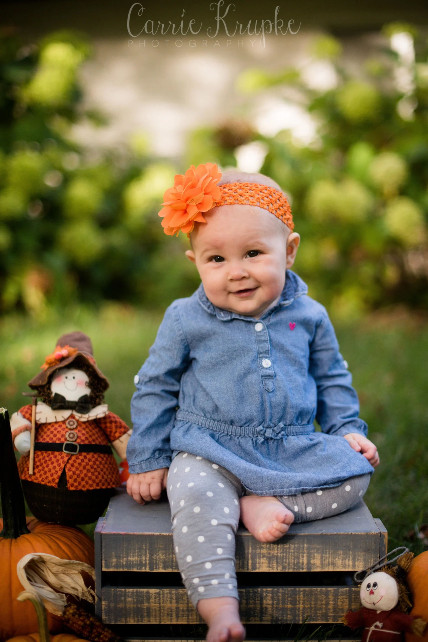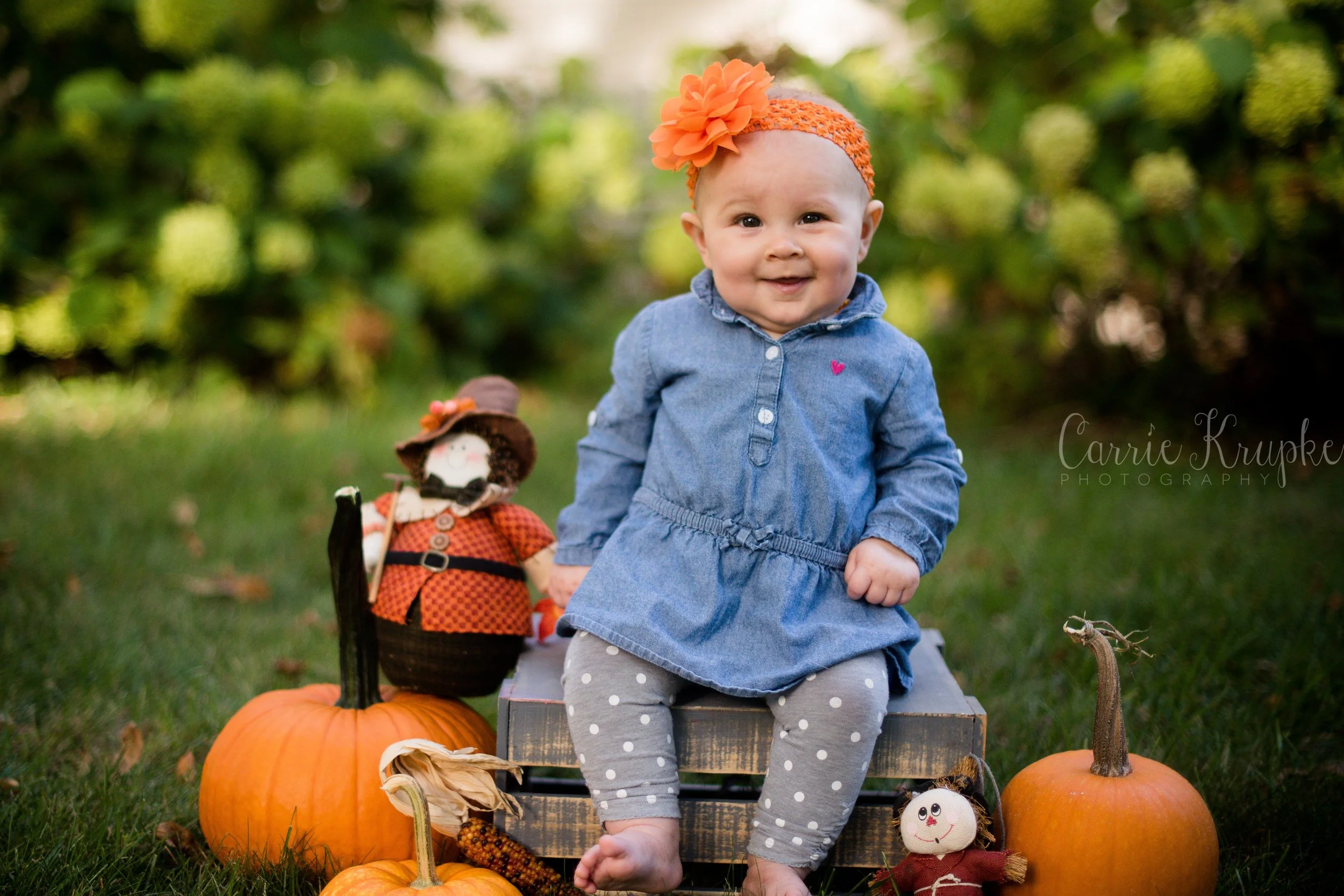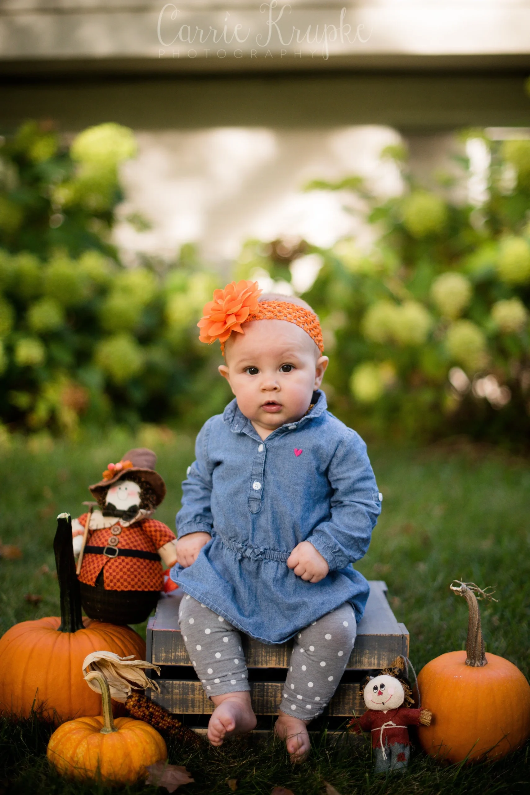 When Katie walked over with Lorelei, Jericho and a few props, I about jumped for joy to see her orange bow and baby pumpkin. We added a few props from my arsenal and had Katie “spot” Lorelei as she sat on the crate. 🙂