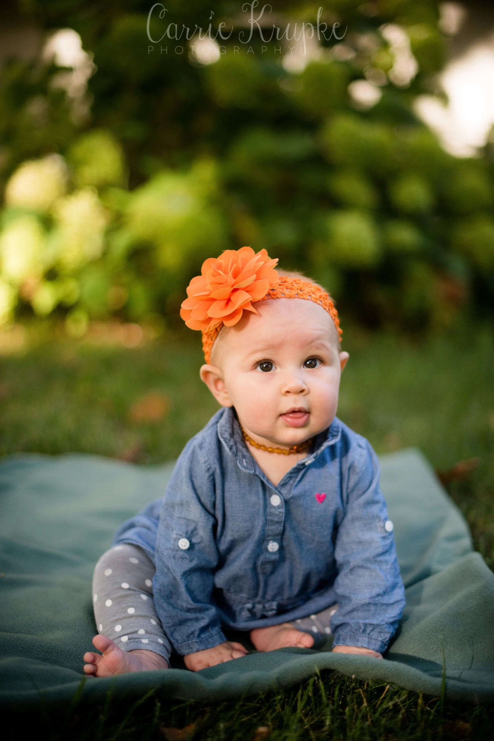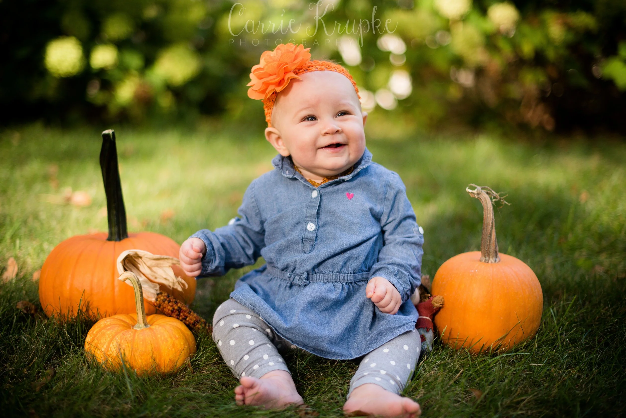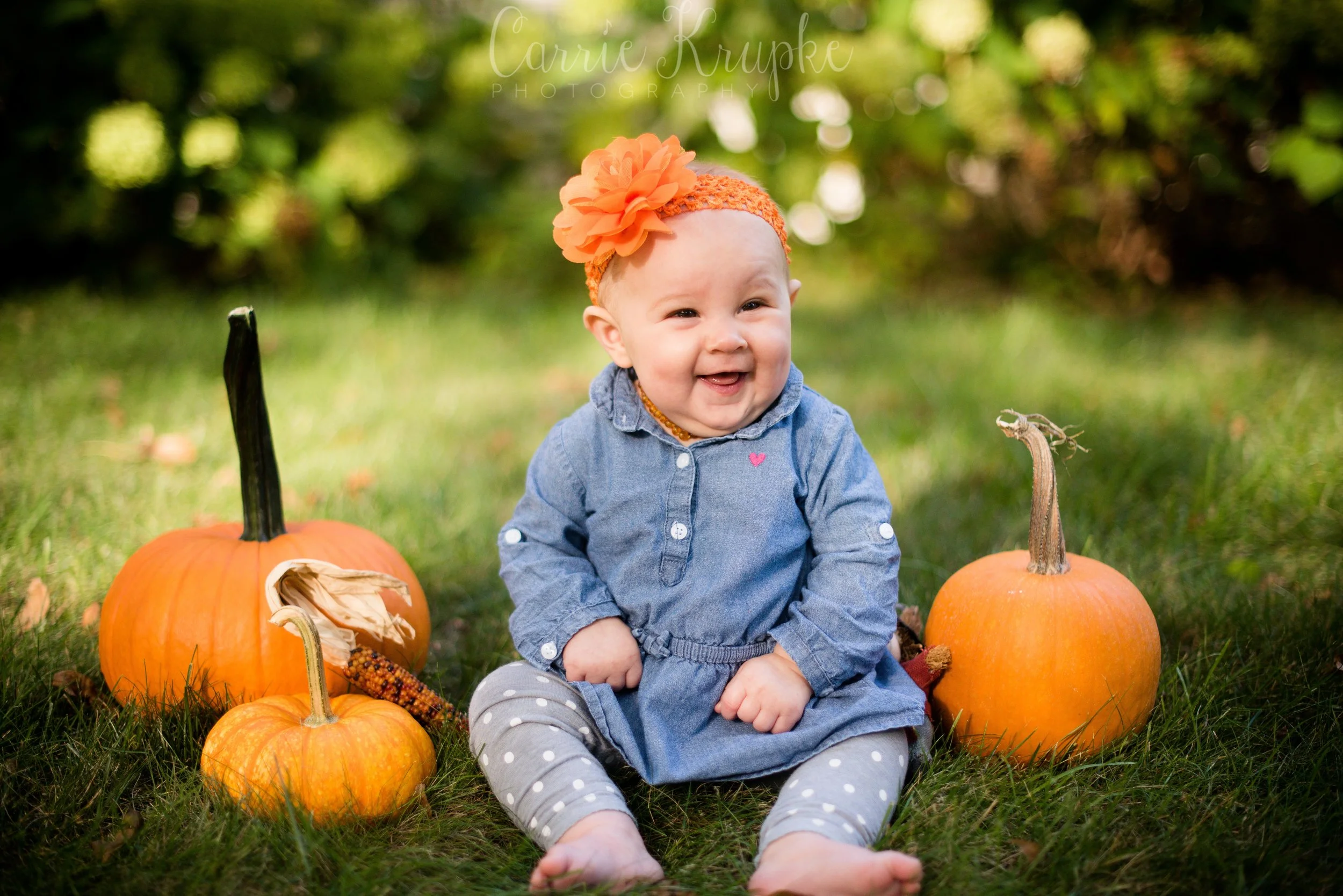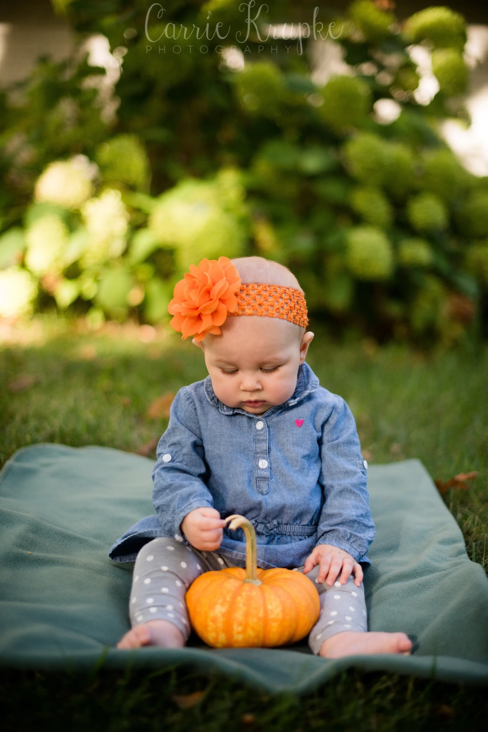 When Katie walked over with Lorelei, Jericho and a few props, I about jumped for joy to see her orange bow and baby pumpkin. We added a few props from my arsenal and had Katie “spot” Lorelei as she sat on the crate. 🙂