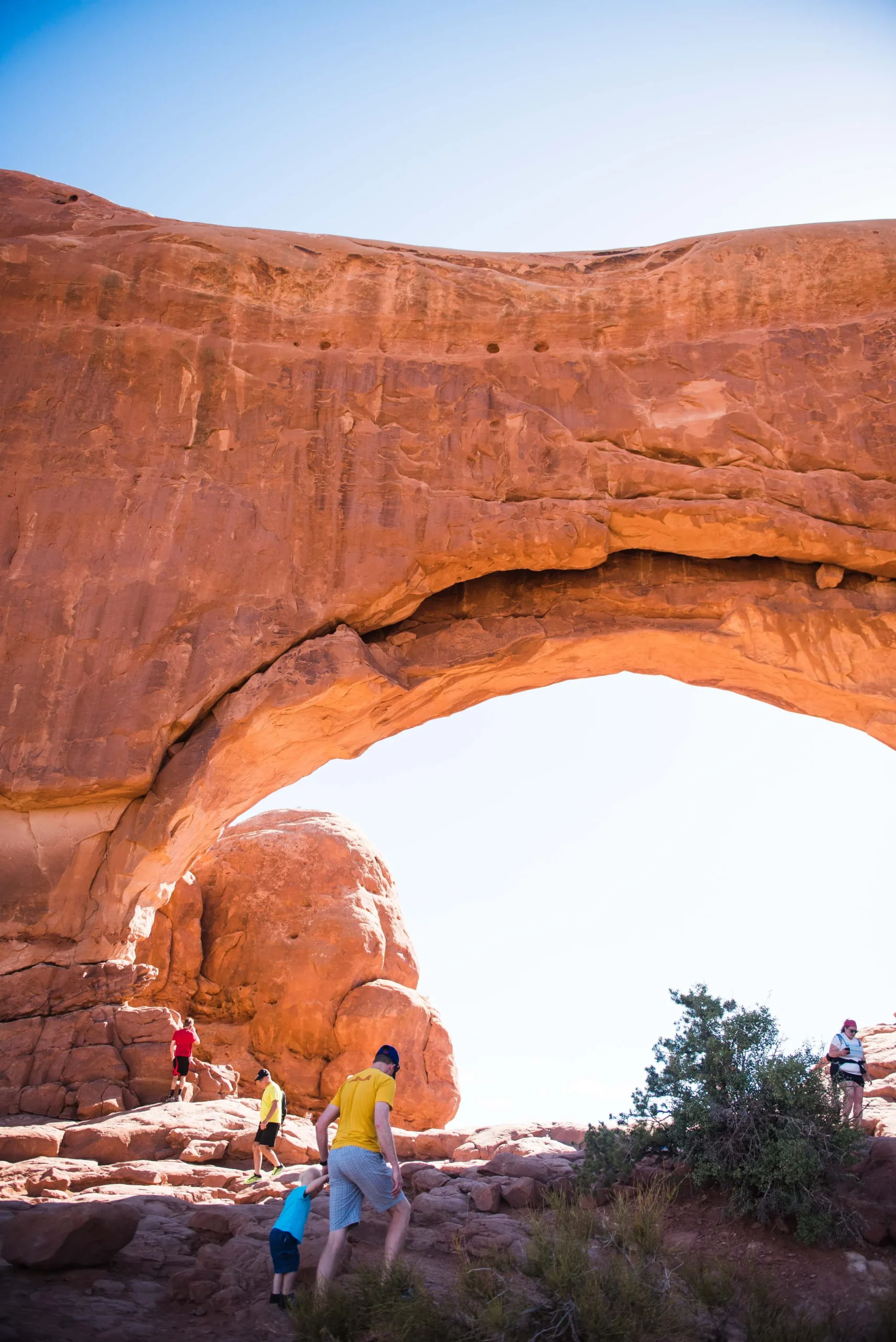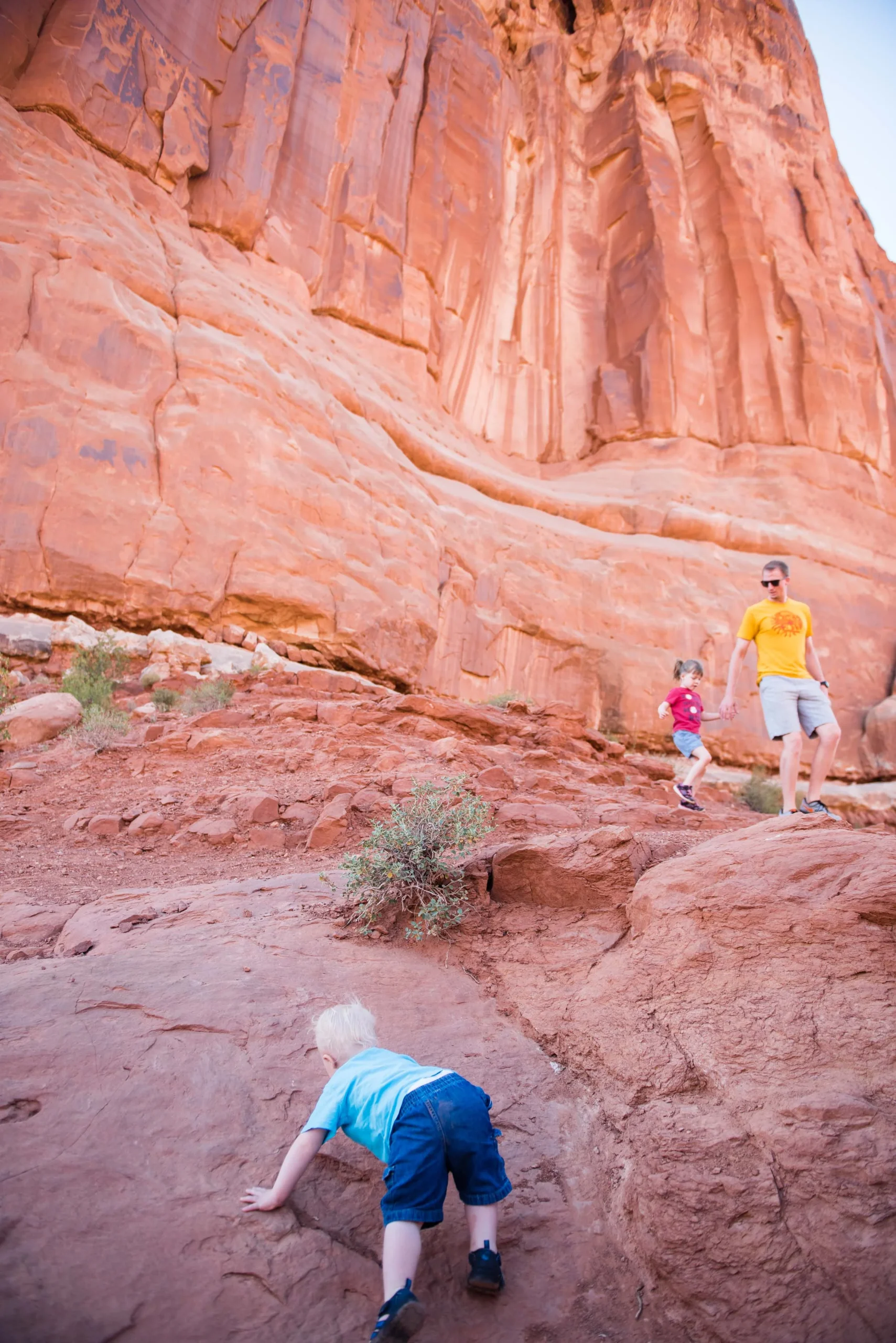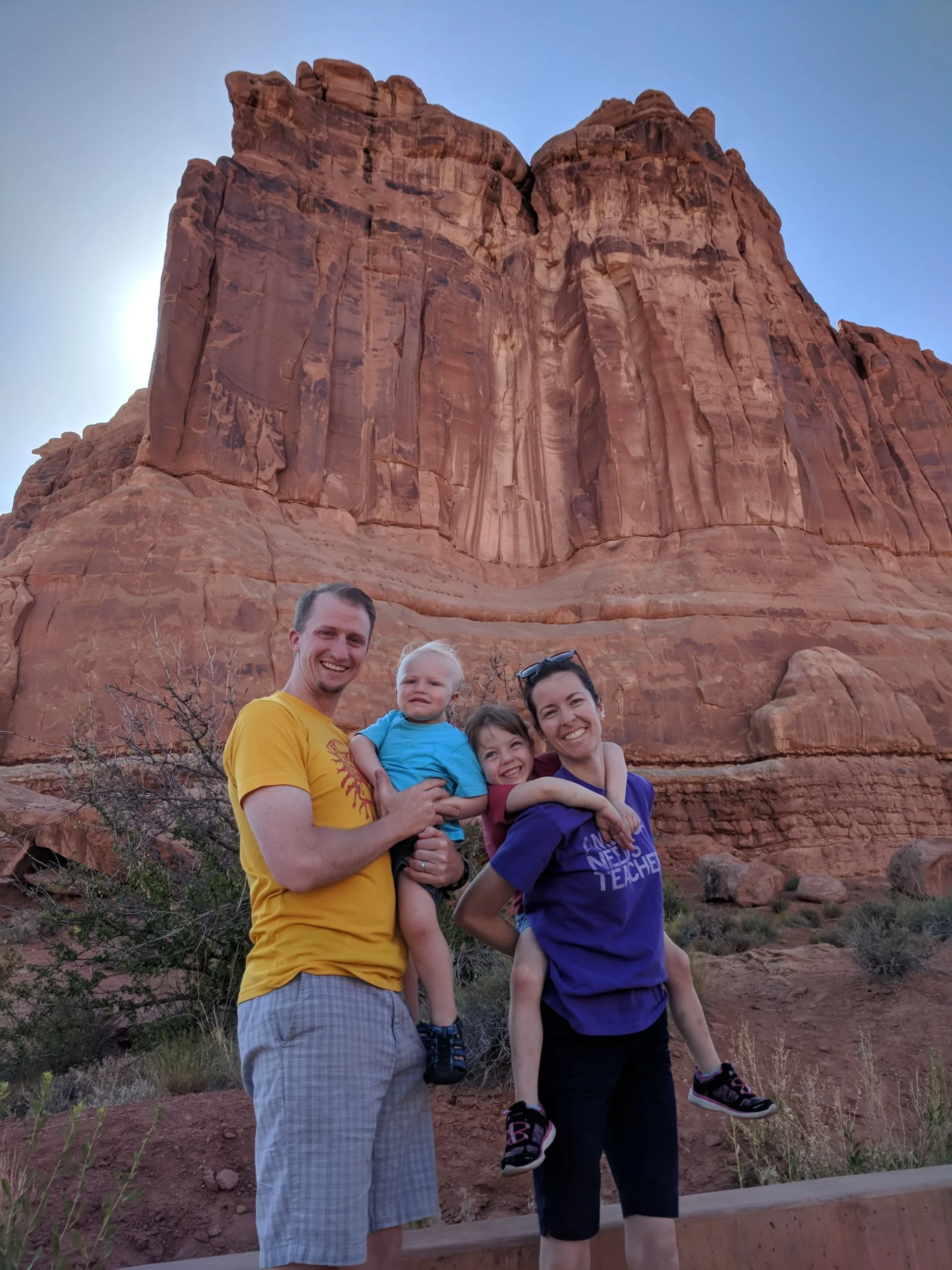 Monday June 18th: got up and to Arches Nat’l Park by 8:30am and the line of cars for entry was LONG. They open at 8:00, I just couldn’t drag my butt any faster after a week of interrupted sleeps. Another “fun scary” moment for me was to climb the rocks from one arch to the back of it for a different photographic perspective. It wasn’t really scary, except when the wind picked up and I had to hug the rock side for good measure. Walking around the Windows Section with the kids was enough to get them worn out and my exercise in lifting for the day was sealed with a piggy back ride for Laidy. The umbrella stroller wouldn’t have worked here for all the steps up and down, so Loch was on Gerard’s shoulders and Laidy on my back for the last stretch to the car. We learned at Mt. Rushmore to give a fellow tourist a cell phone to take a group shot as when I handed them my camera, Rushmore was in focus but we were not. (whomp whomp) So, all our family group photos the rest of the trip are phone camera quality.