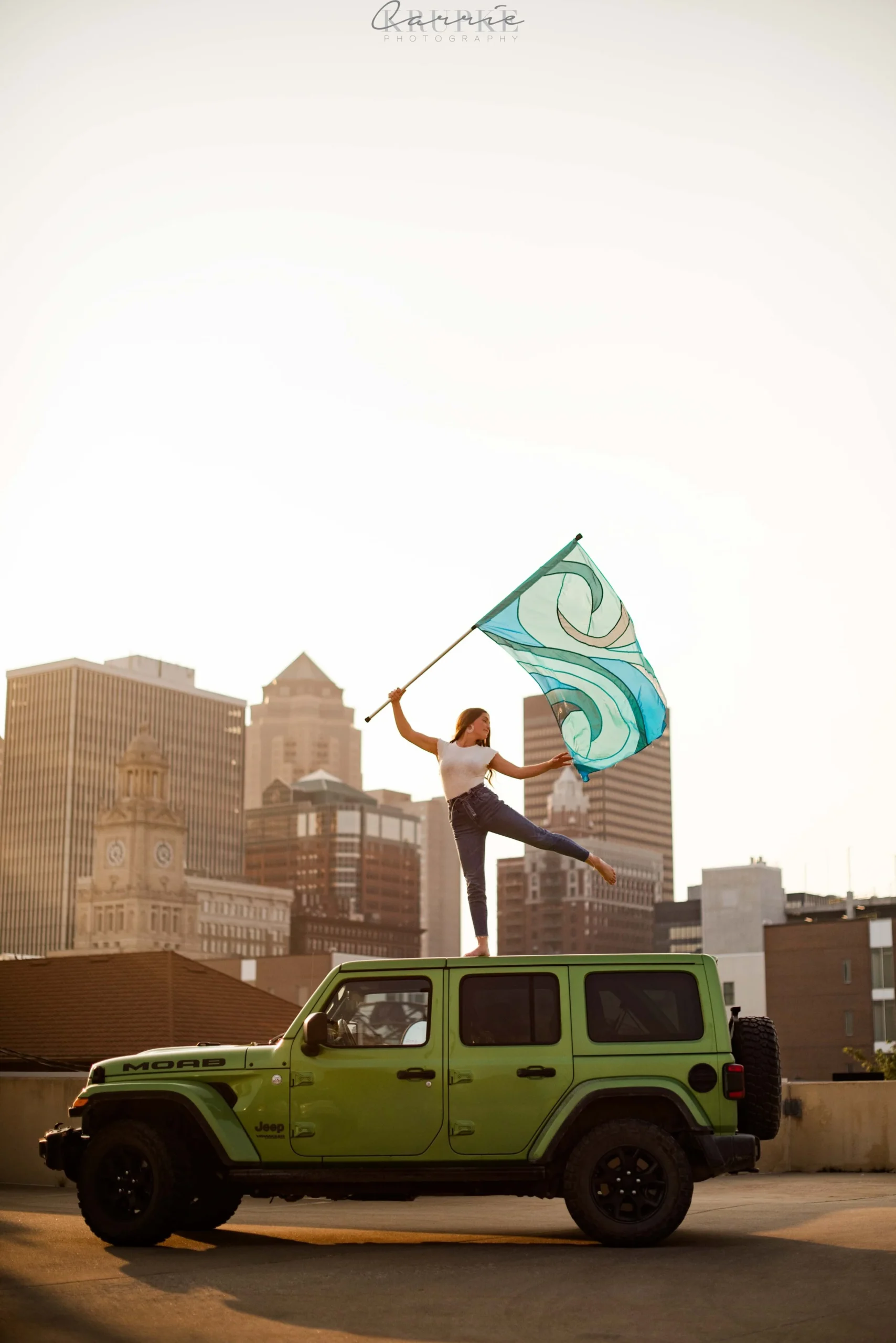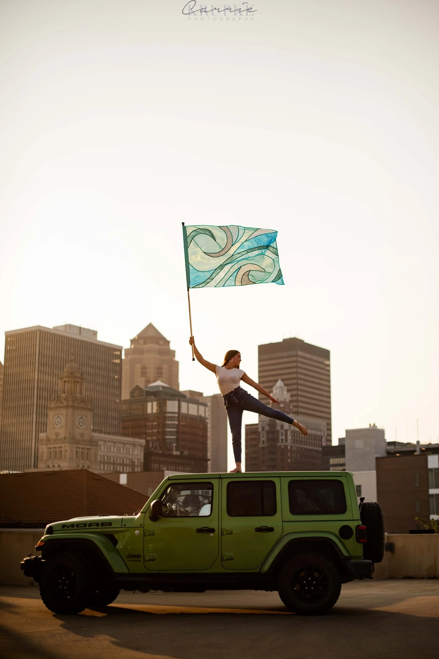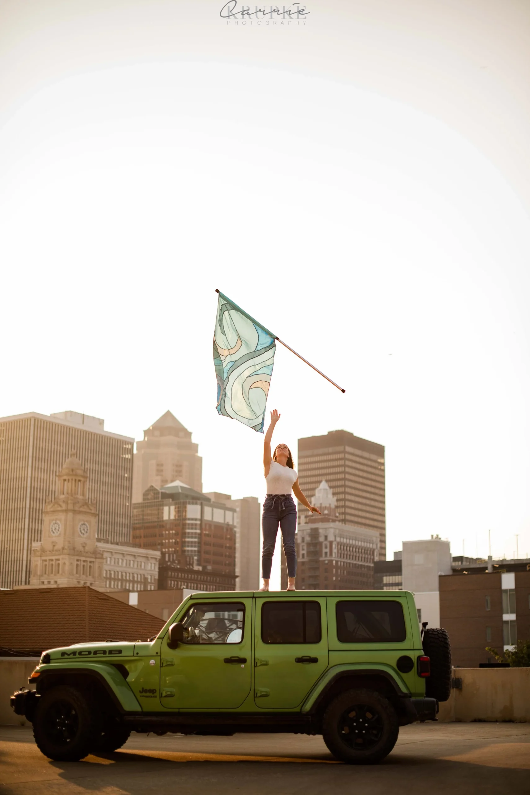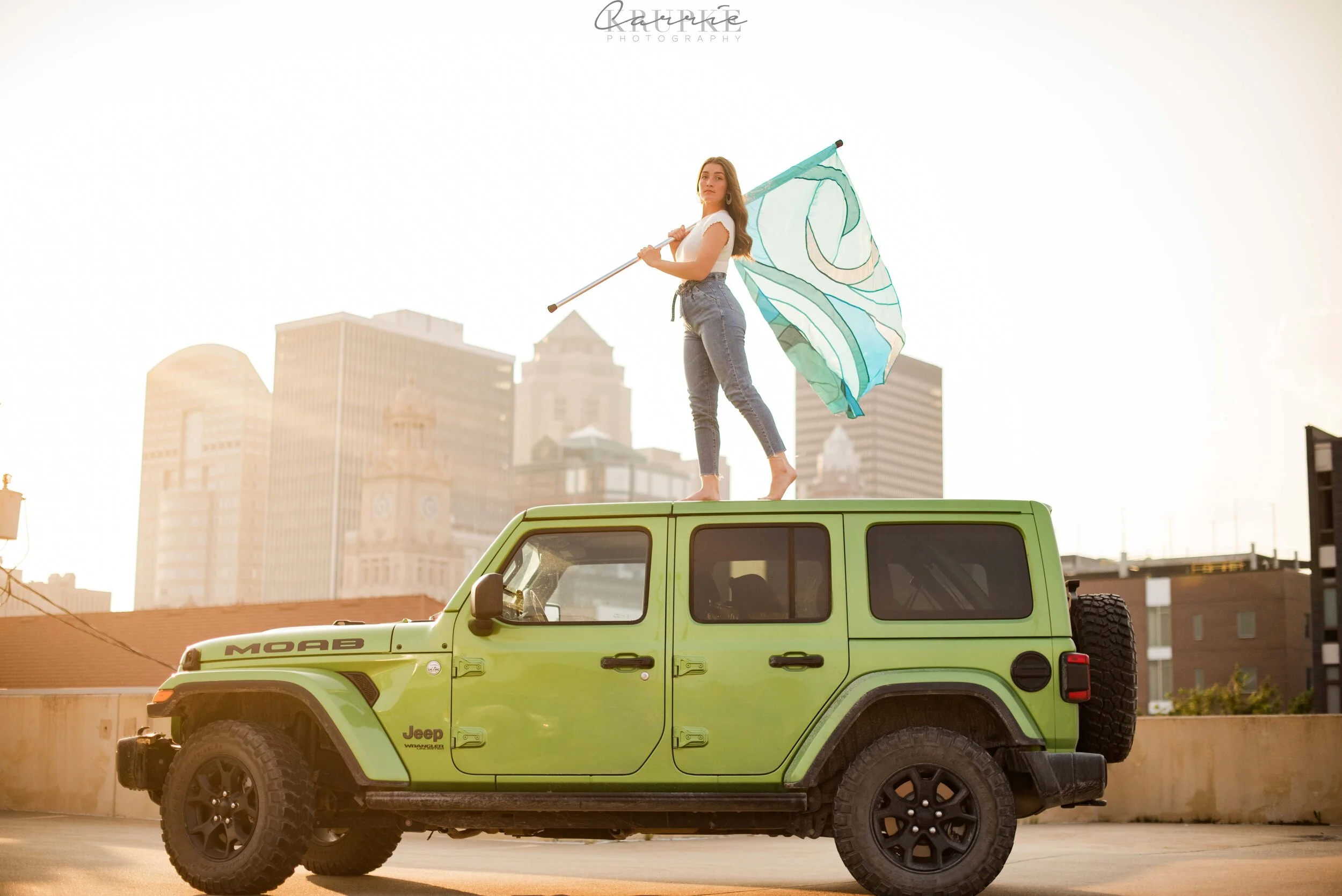 When Mom drives a bright green jeep, I felt we needed to use it to give Allison more height to use the downtown skyline in a way I’ve not done before. Jeep, check. Color guard, check. Showcasing color guard while ON A JEEP? Never have I done THAT before! I am thrilled with how well Allison showed her femininity & strength in these poses while balancing ON A JEEP. mic drop