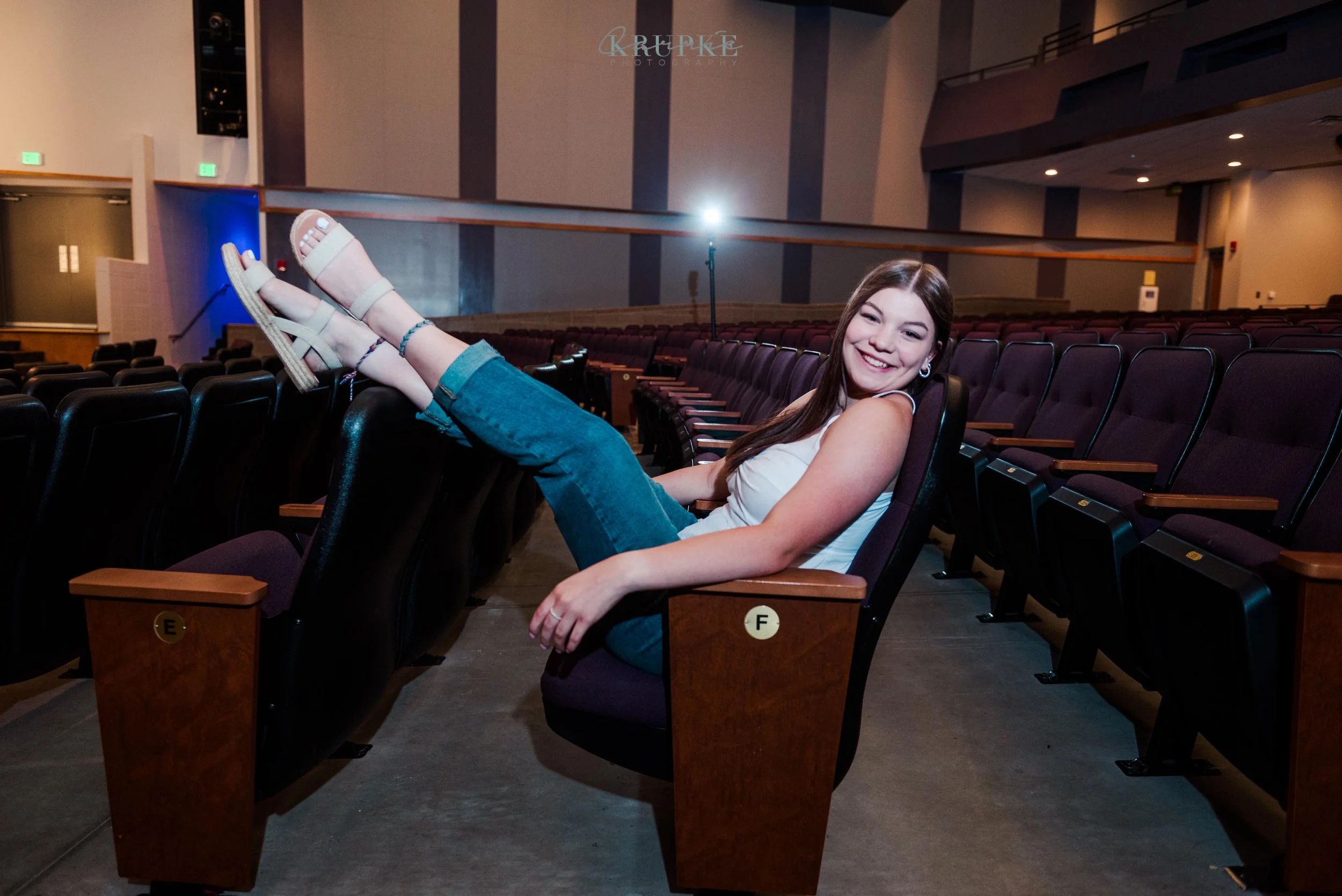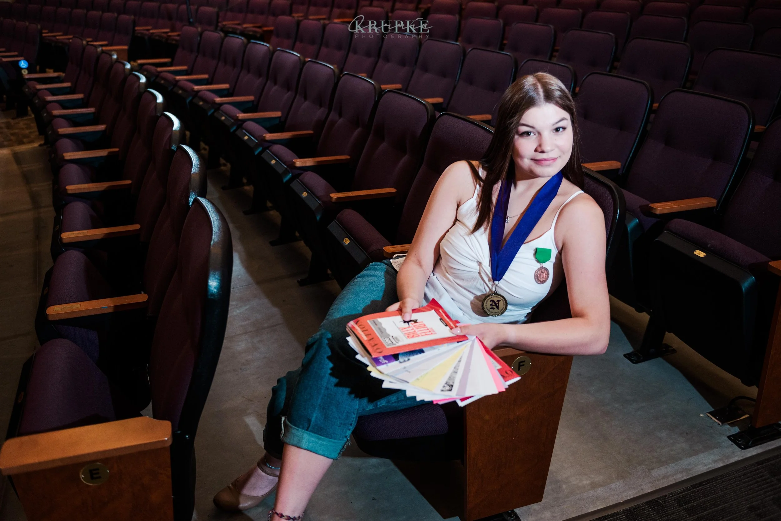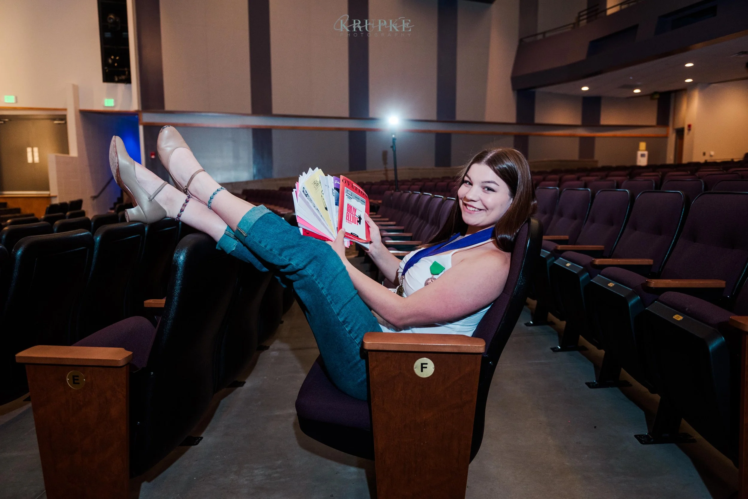 The challenge is always: how to make a location I’ve already used look different for each senior. Addie has been in SO.Many.Plays with both the Des Moines Playhouse and within her school career that we had to feature where she’s spent countless hours: both her high school auditorium and the Des Moines Playhouse itself. I’m so thankful she was flexible and trusting of a few ideas I had and I love the results of making the auditorium look different than any other student I’ve photographed. I wanted to make it look like “this is Addie’s house” and she owned it! Just look at all those playbills and programs that aren’t even the entire collection!