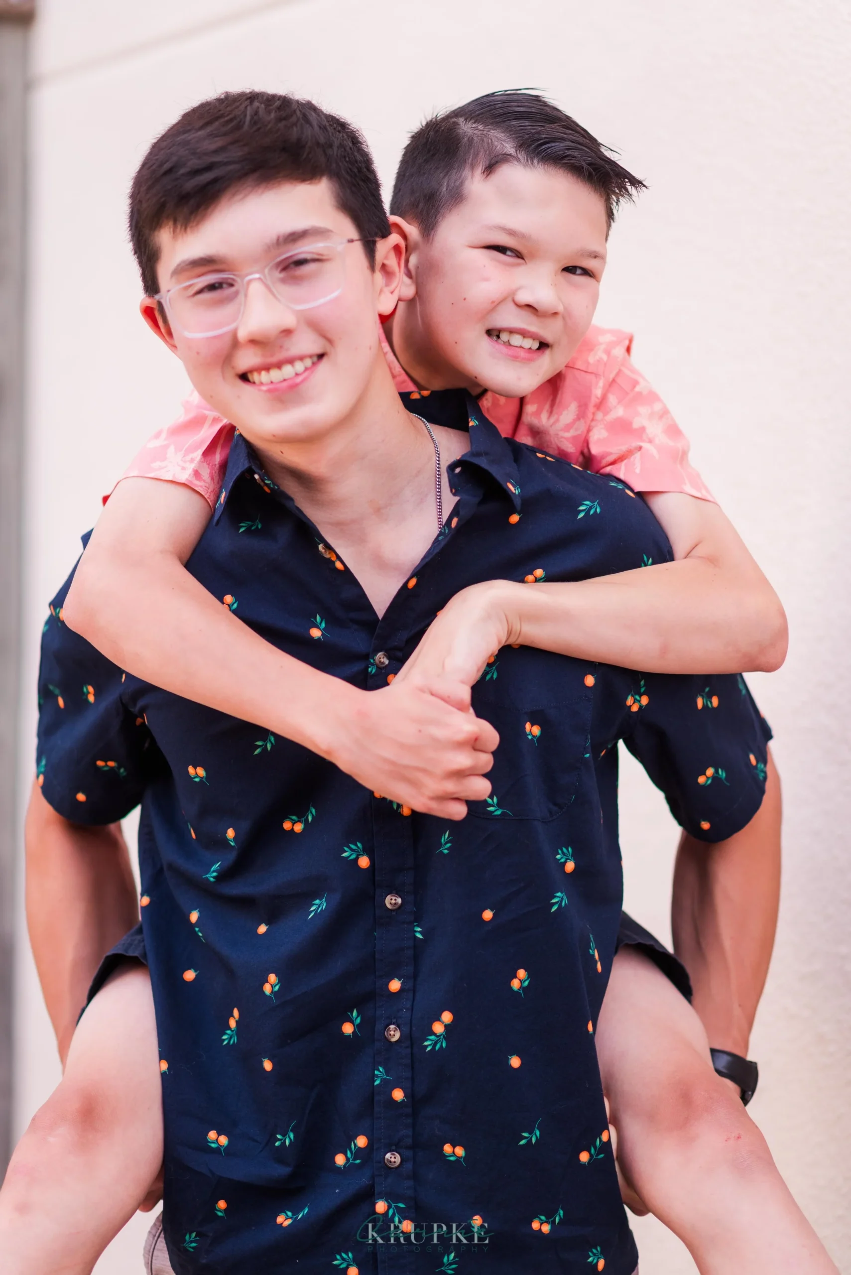 We always get one photo with Carson giving Brecker a ride and as an athlete than can stand to run a whopping 28 miles in one go, I’m sure he’ll be able to do this pose for years to come! I was so impressed when he told me that fact, I was speechless! Breaker is an accomplished Ninja Warrior himself – truly fun to watch these two succeed doing things they love!