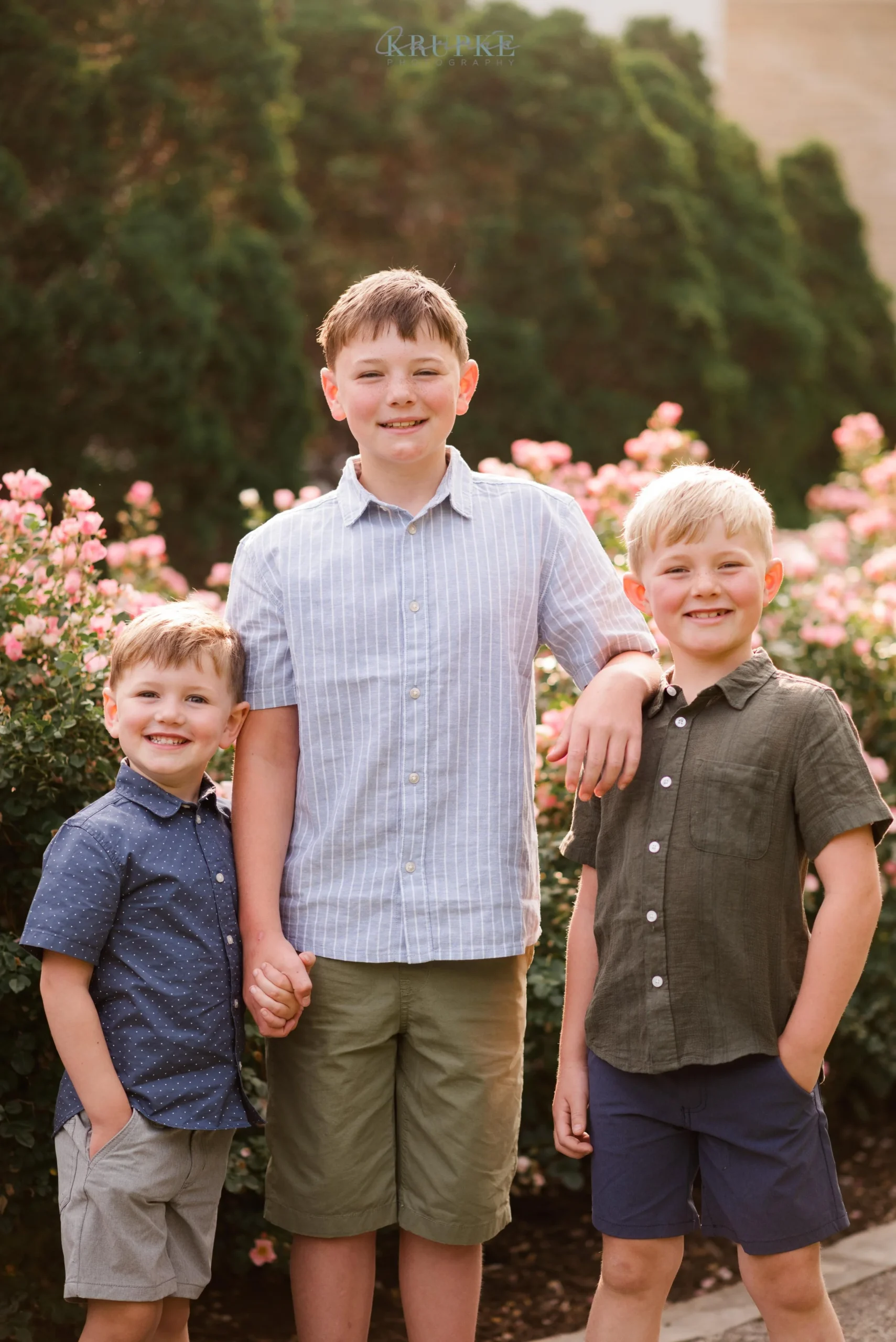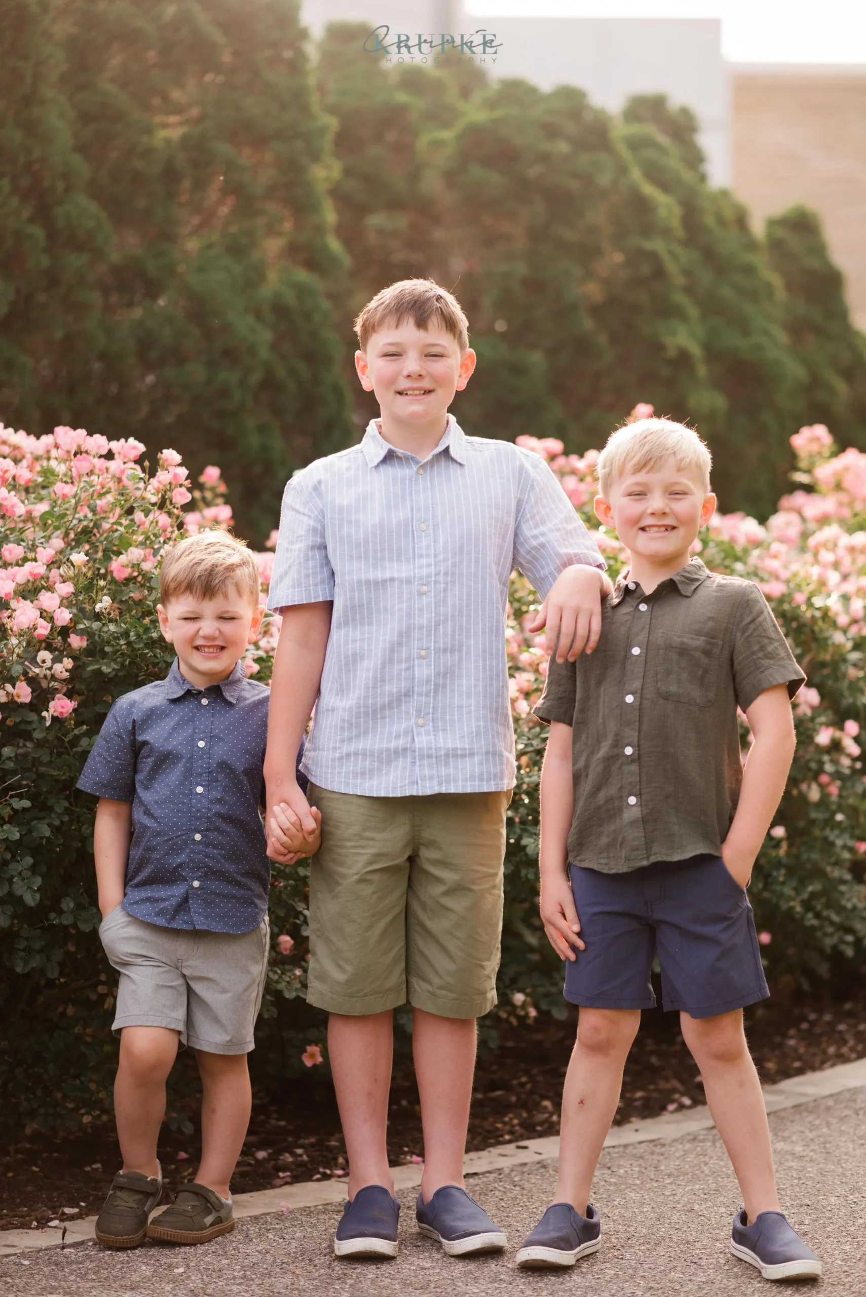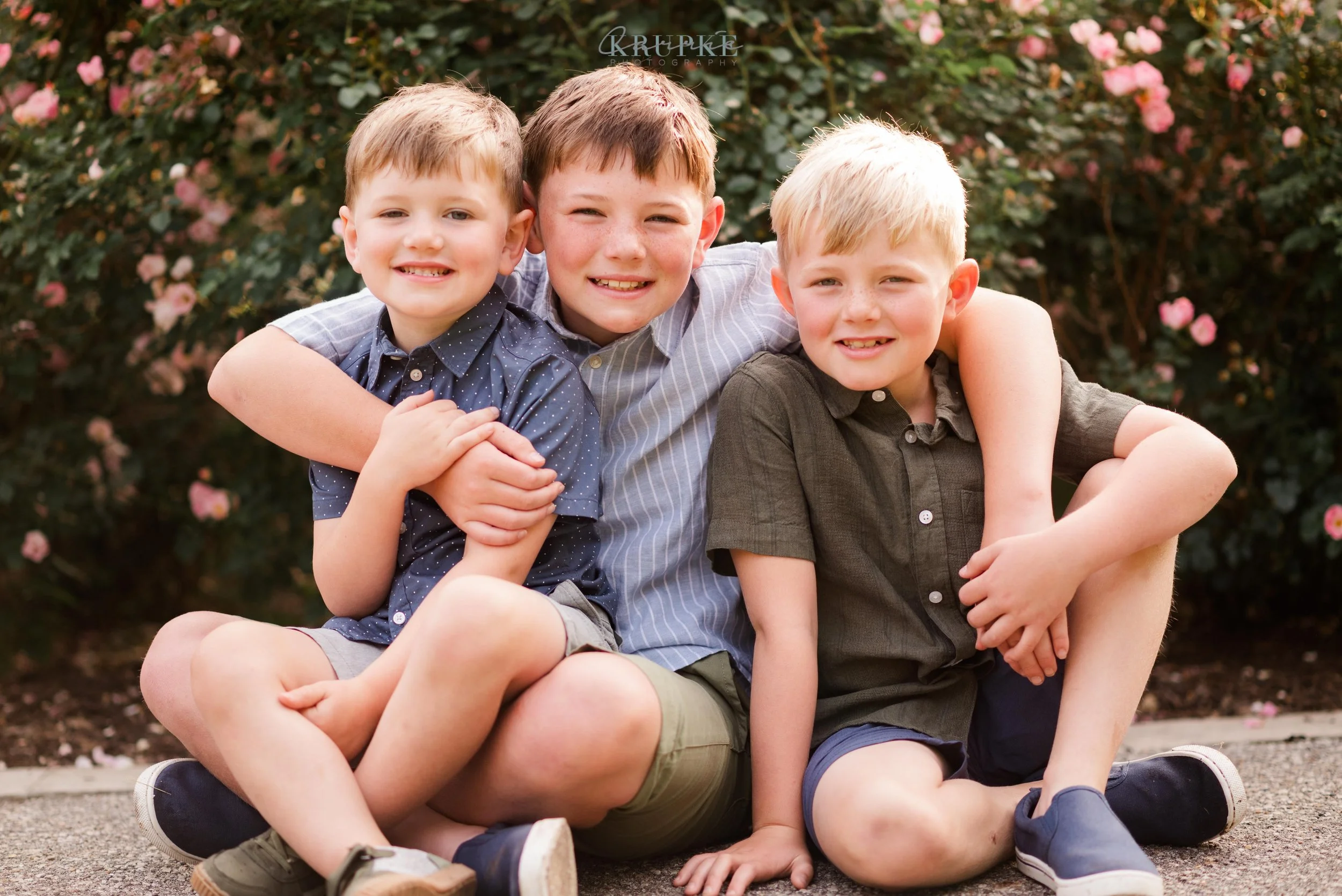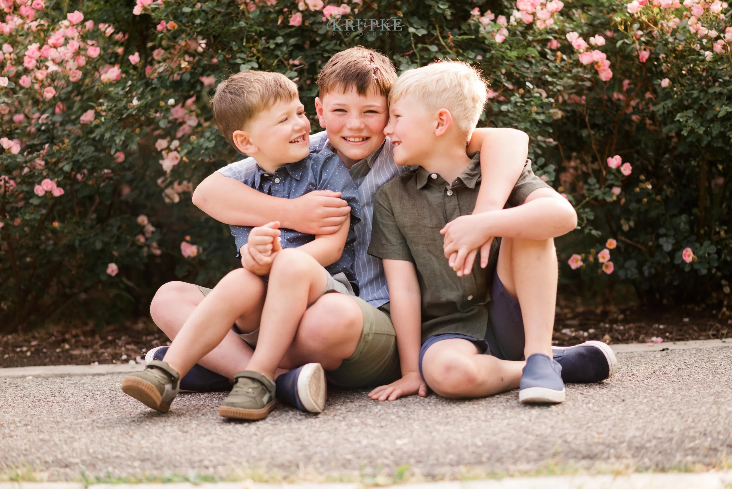 Graham, Blaine and Vaughn wear HUGE smiles and because we’ve had our kids play together, they will follow me up a steep, muddy hill too. 🙂 Their goofiness is such a bright spot in my day and makes for hilarity throughout our session together. When I told Amanda that the roses were in bright bloom, we went for it and forgot all about Greenwood Park!