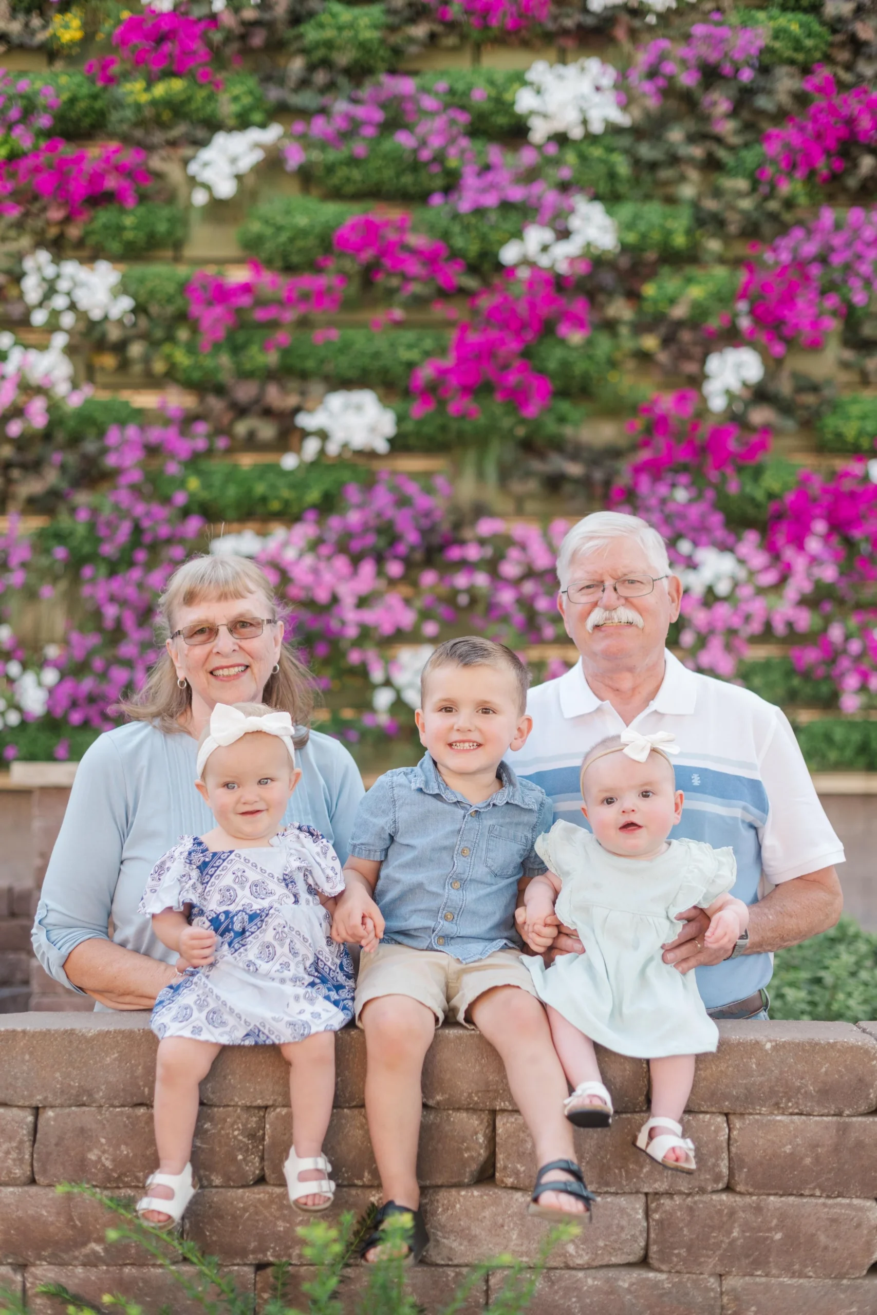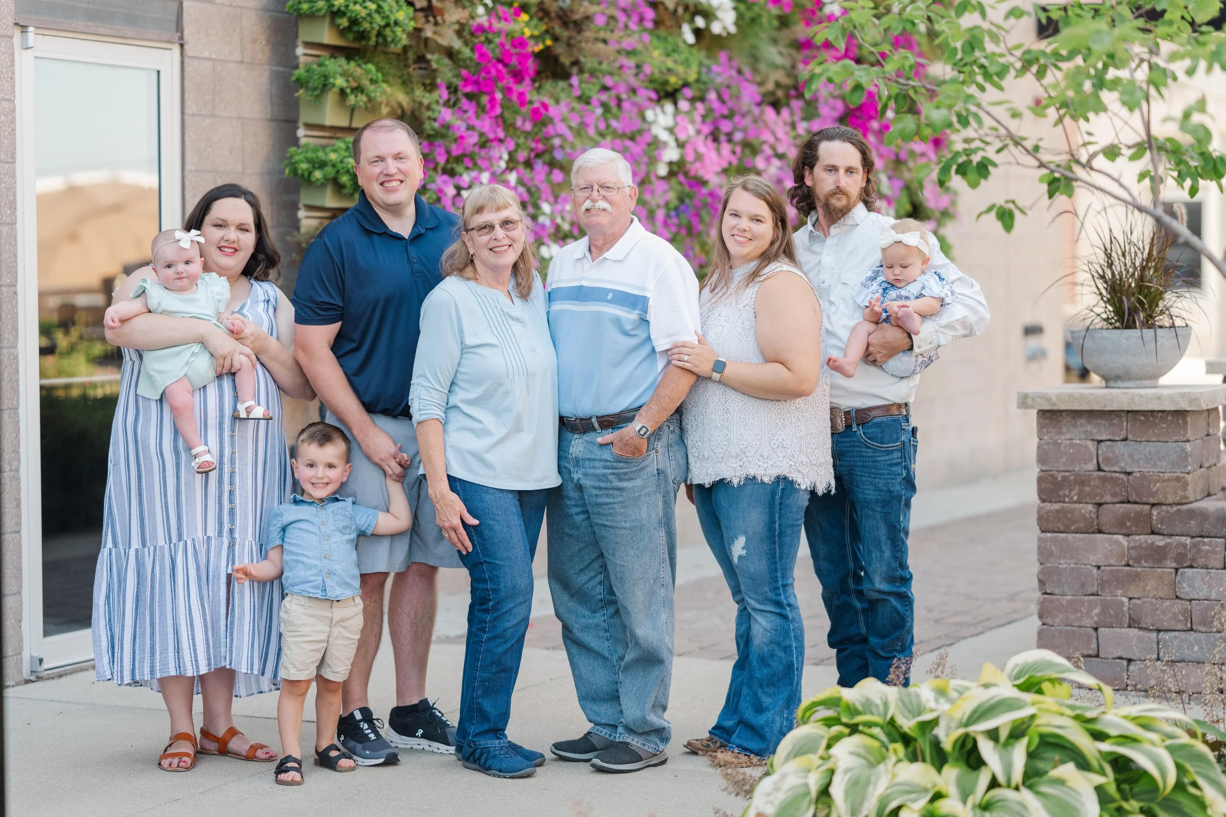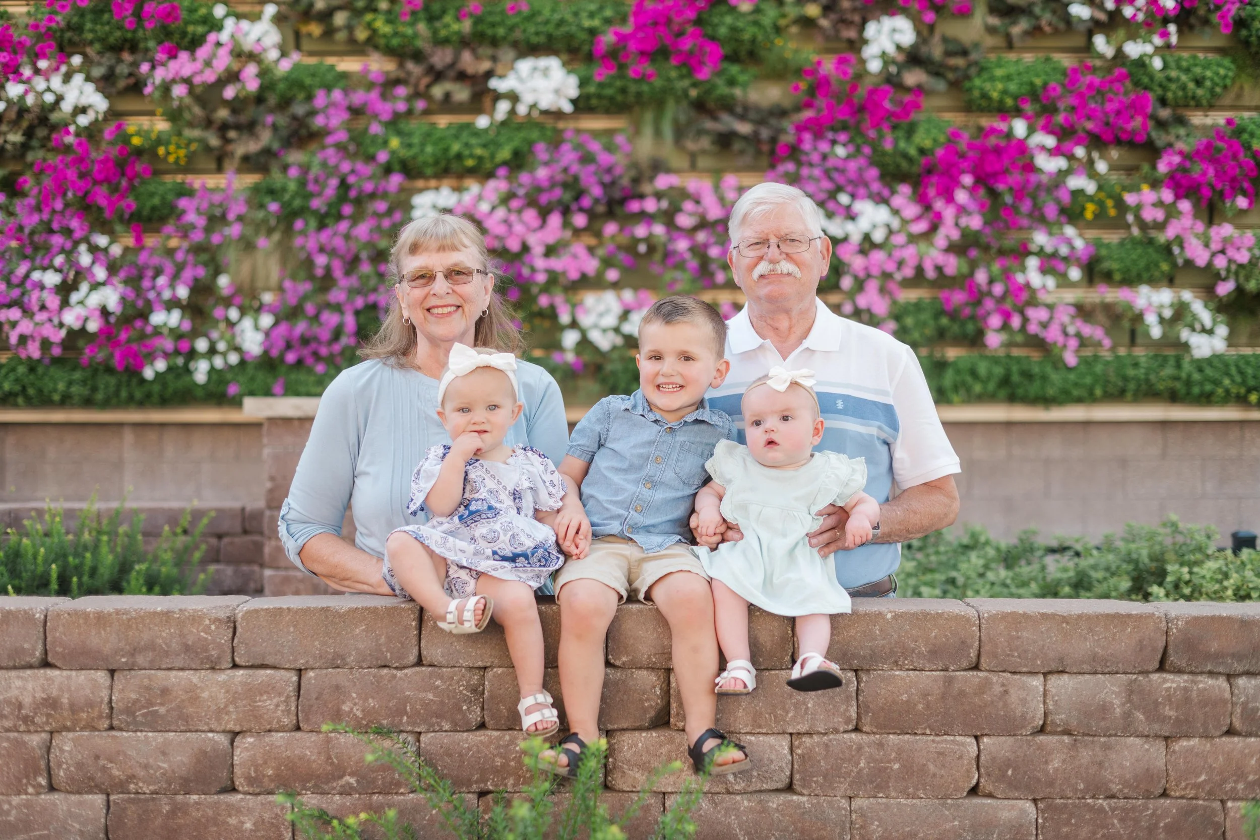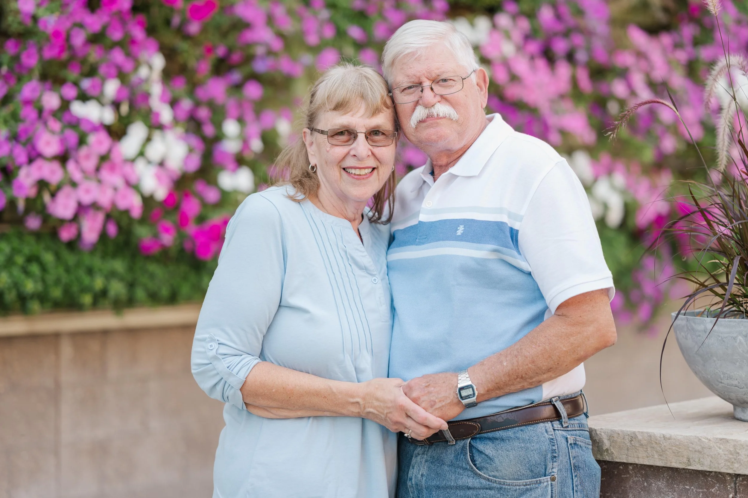 Last Christmas, Megan reached out for a gift certificate for her in-laws’ anniversary. Here’s the sweetest story – Brad’s parents knew each other in high school and dated for a few years. Bob graduated and during Marla’s senior prom, he proposed!! Fast forward 51 years and they now have a son, a daughter and three lovely grandchildren (not to mention an awesome daughter in law and son in law) 😉 . Marla recommended the cutest little garden area in Marshalltown with a wall filled with flowers and it made for a perfect backdrop for the majority of our photos! Take a peep: